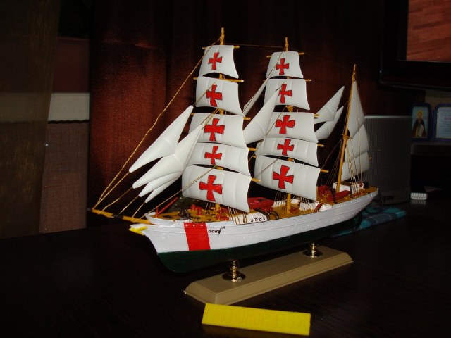 В названии - "Горхъ фок", расцветка корпуса - американский "Игл" береговой охраны, на парусах - кресты португальского "Сагреша".