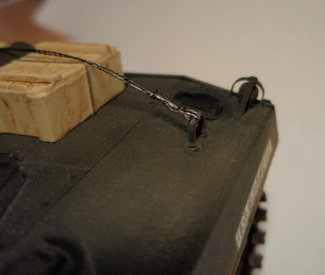 Не совсем понятен механизм крепления проволокой ( тросиками)- т.е. раз и навсегда?, а спереди вообще "лабиринт" . Представляете как всё это посыпиться при движении танка!Сами тросики тоже не очень. Цвета "барахлишка", пулеметной ленты с патронами??? Видны подолжки декалей...Основная окраска неплохо.