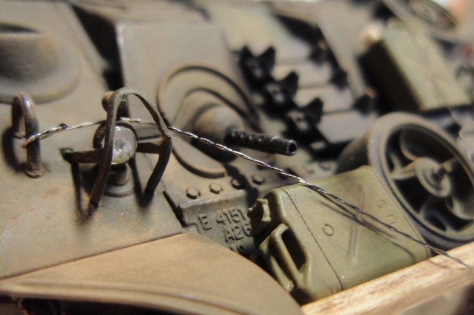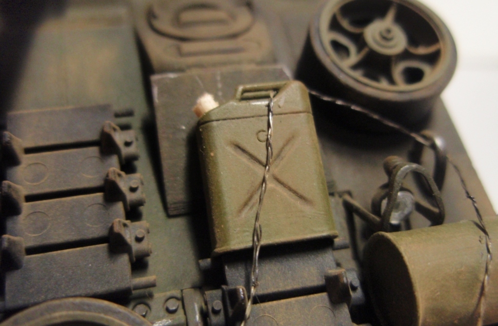 Доброго времени суток, уважаемы каропчане! Представляю на Ваш суд свою первую модель в ходе работы над которой я узнал, что помимо красок и кистей существует еще много "вкусностей", например, такие как пигменты и смывки. Сборка откровенно меня порадовала (особенно после некоторых отечественных производителей, окромя которых достать возможности у меня не было). Из-за нехватки свободного времени в матчасть особенно не вникал, и вот что получилось... От себя добавил: перекладина на лобовом листе- палочка от мороженого, защита задних фонарей- сплющенная проволока, сетки в воздухозаборниках- фильтр от чайника, к башне прикрепил поручни на которых на ремешках висят сумки и стальные шлемы, остекление фар- от детской игрушки, рассверлил пулеметы, в канистру вместо крышки забил деревянный чопик. Красил Тамией (аэром первый раз), пигменты MIG.