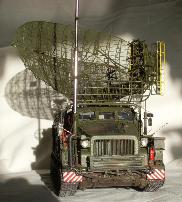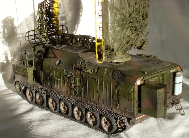 Сборка и окраска с 1 октября 2011 по 2 февраля 2012. Такой большой срок из-за огромного объёма доработок. Писать о них нет смысла (ибо слишком много), желающие просто могут сравнить с референсной моделью на сайте производителя (http://www.panzershop.cz/inshop/). Изкоробочная версия без проблем собирается за месяц, но её копийность где-то в районе 60%. Из серьёзных косяков: маленькая высота обитаемого отсека кузова, неправильные углы наклонных поверхностей кузова, неправильная форма зеркала радара и траки с ведущим колесом от Т-72 (на реальной машине стоит ведущее от Т-54 и траки ОМШ-500). Всё это было исправлено, но опять же по фоткам, т.к. чертежей нет.