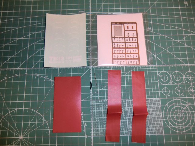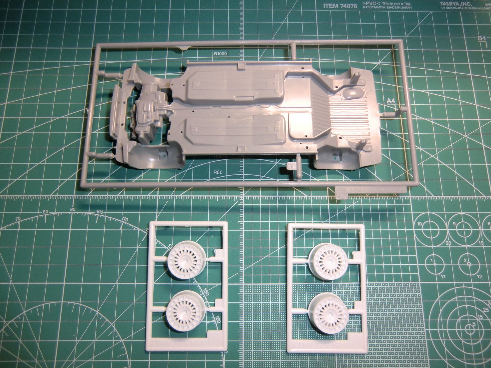В коробке 11 литков (из них 2 прозрачных), кузов, фото травление (для имитации ремней безопасности и др. мелочёвки), три кусочка прорезиненной ткани ( 2 для ремней и третий для брызговиков) которые предлагают изготовить самим. Всё расфасовано в различные пакетики. Так же 4 покрышки, деки, кусочек проволоки и резинка.