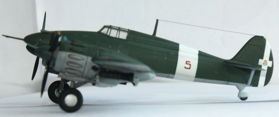 Окраска: "прешйдинг" - Tamiya XF-1; интерьер - Tamiya XF-21:2 + XF-5:1; низ –Tamiya XF-2 + XF-66; верх –Hobby Color H302 Verde Mimetiko2 FS34092. «Постшейдинг» - краска более тёмного оттенка. Потом покрыл футурой, нанёс декали, опять футура и смывка – «MIG». Финишное покрытие – Х-22 с наполнителем Х-21. Нанес нагар. Потёки масла и бензина - Tamiya X-19 Smoke. Антенна – мононить.