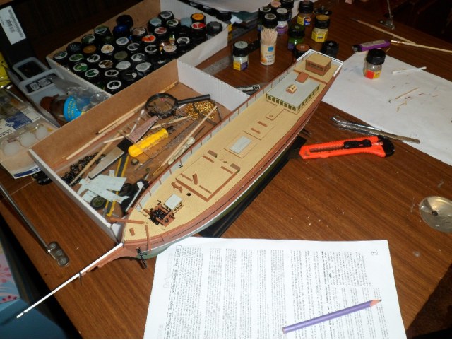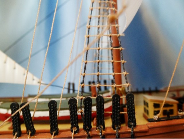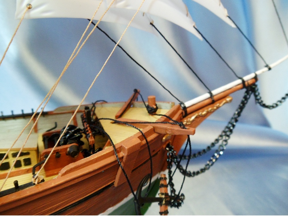 Такелаж как таковой отсутствует. Юферсы на вантах смещены. Бушприт перетянут. Якорь установлен не правильно, лежит не на месте. Цепь смонтирована не правильно. Зачем вы ее пустили из якорных клюзов на бушприт? Нонсенс.