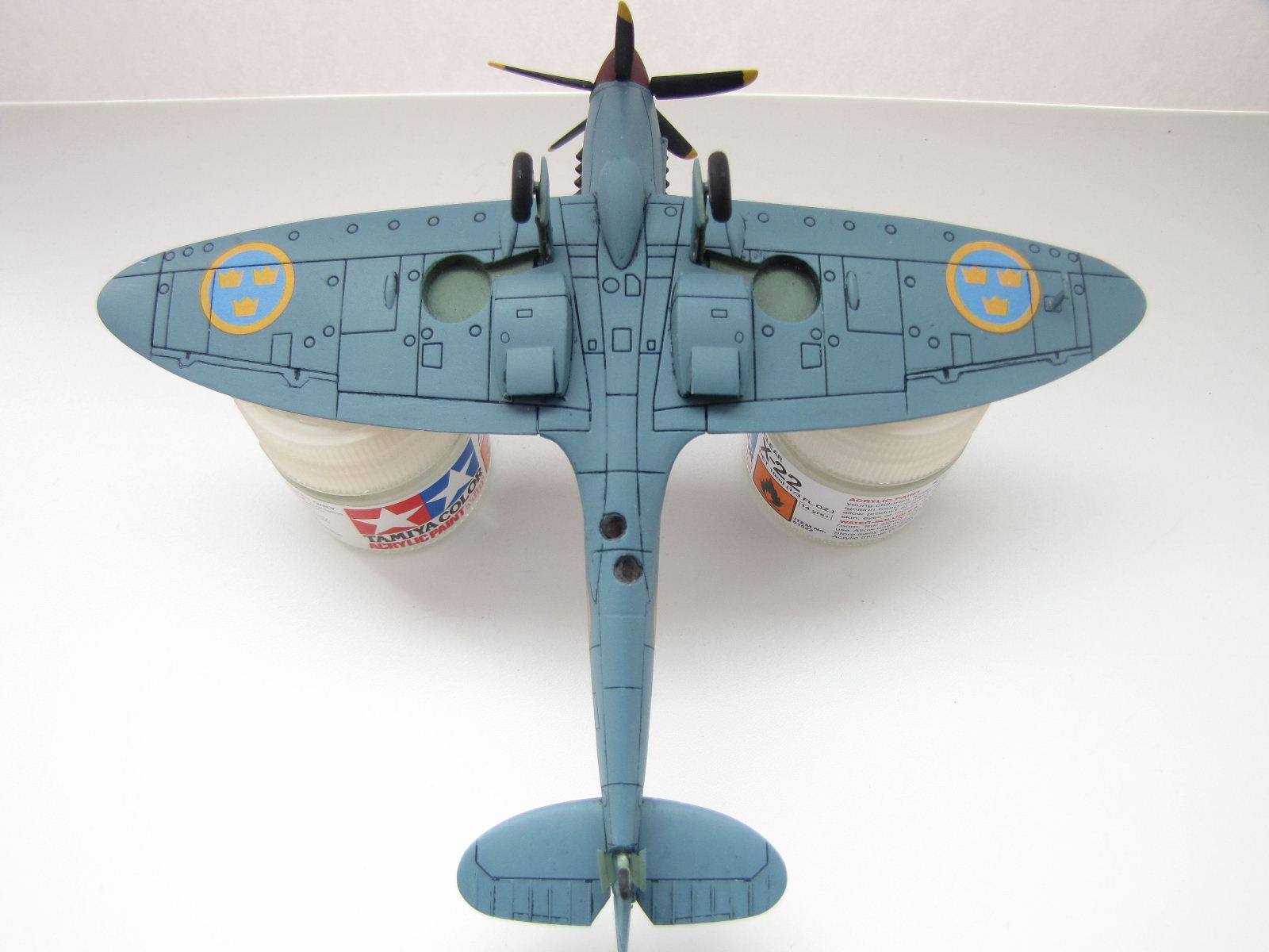 Выхлопные патрубки - Quickboost, окрашены черным и ржавчиной. Я выбрал вариант шведских ВВС, цвет - PRU Blue, красил как всегда тамиевским акрилом. Декали приваривал "тройным" одеколоном. Никак не могу победить жидкость Mark Fit, скатывается калями с декалей, "приваривать" никак не хочет.