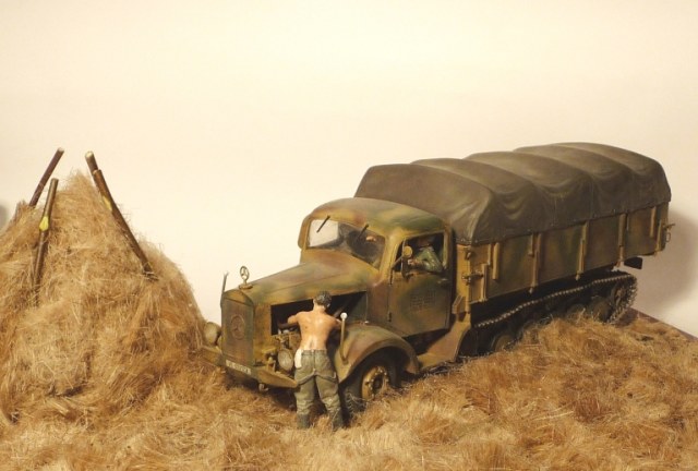 На самом деле,я эту модель уже выкладывал на "Каропке" .Собирал её мой друг и однокашник по Суворовскому военному и Высшему общевойсковому училищу,он же сослуживец по Печенге ,а также мой тёзка Дмитрий Захаров. Собрана модель была больше года назад им,а мной покрашена (я уже 3-х человек заразил болезнью,которая называется моделизм). Сегодня совместными усилиями ,при помощи его сына и бутылки виски было создано основание.Как-то спонтанно мысль возникла,поэтому времени на изготовление ушло немного,около 3,5 часов.Материалы тоже примитивные-то ,что дома было-шпатлевка,лён сантехнический ,ветки от какого-то куста во дворе , рамка для фотографий и немного пигментов МИГ . Исторической привязки нет,будем считать,что действие происходит где-то на юге Украины в августе-сентябре 1944 года.Спасибо за внимание,к адекватной критике и дельным советам готов .