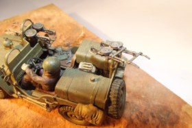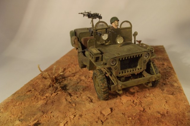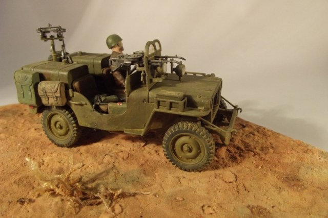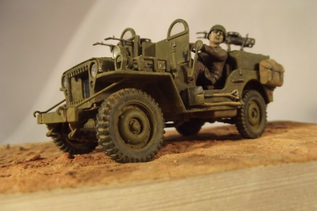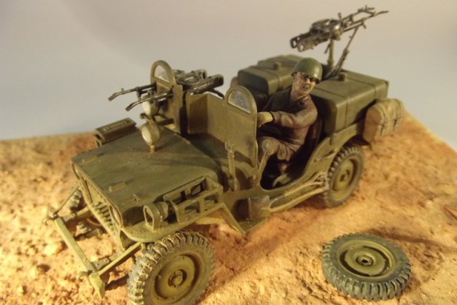 '..Этот автомобиль предназначен также для транспортировки по воздуху далеко в тыл противника. В наземных действиях джипы помогали пехоте подавлять огневые точки, уничтожать снайперов и т.д. Экипаж чаще всего - 2 человека ( водитель и стрелок). Варианты снаряжения и вооружения многочисленны; - обычно не менее 5 пулеметов и дополнительные баки для 135 литров горючего..". Отличие от базовой модели только в форсированном двигателе, мощность которого доведена до 60 л.с. при 4000 об/мин. Несколько увеличена длина ( за счет вынесенного вперед для безопасности переднего бампера) и меньше высота ( за счет снятых дуг крепления тента и более низкого заднего борта).