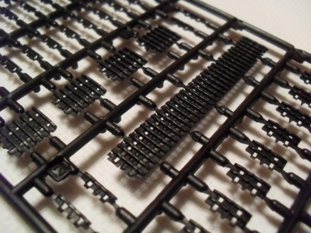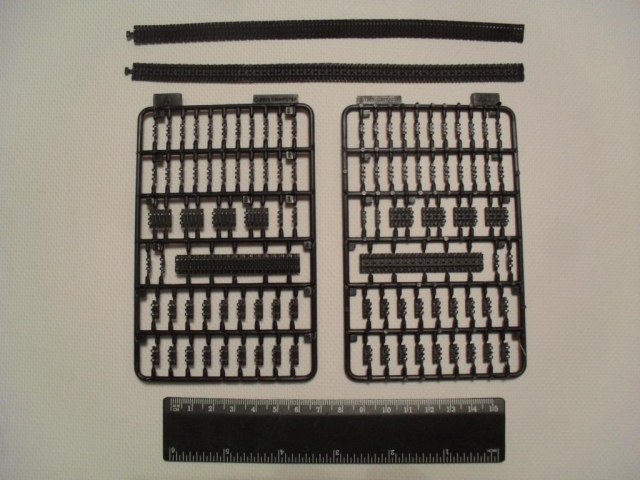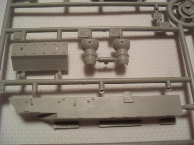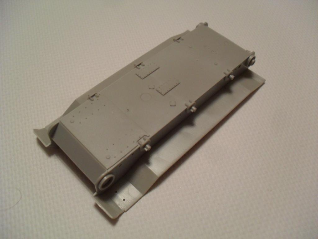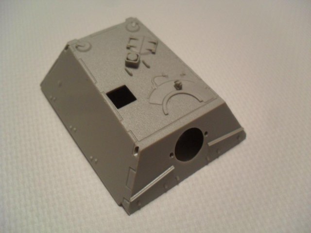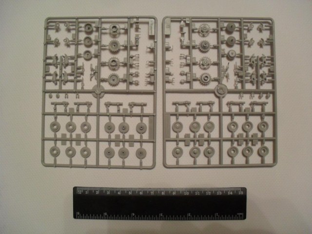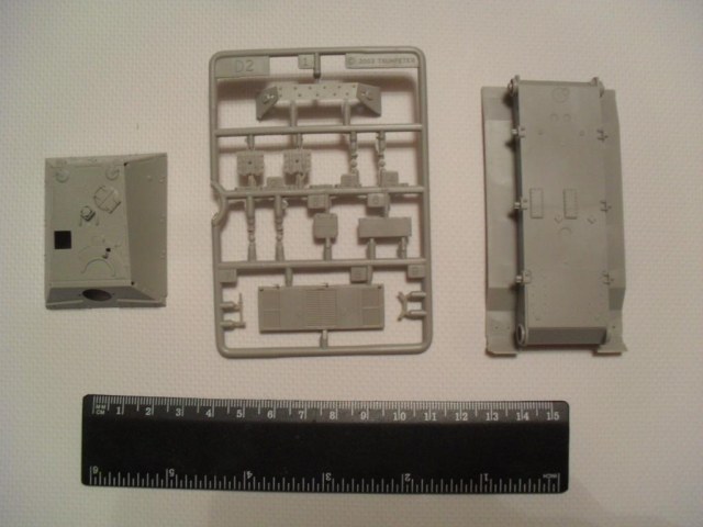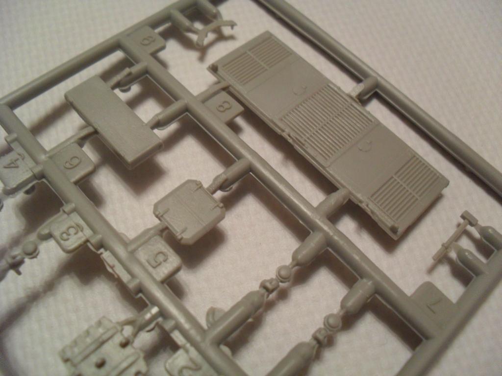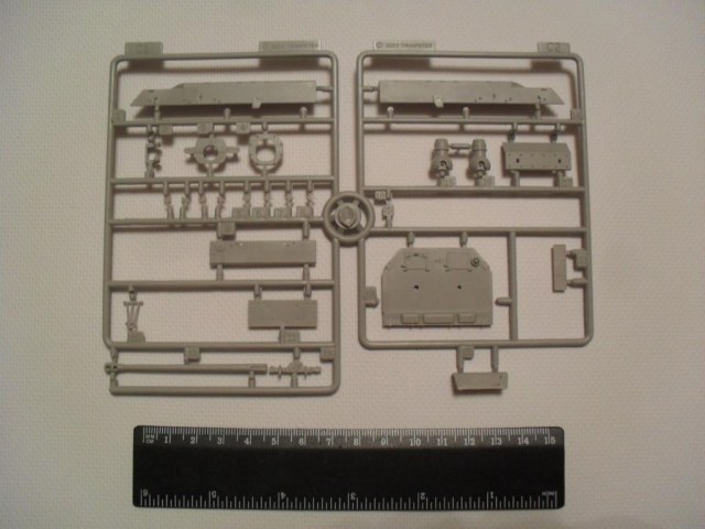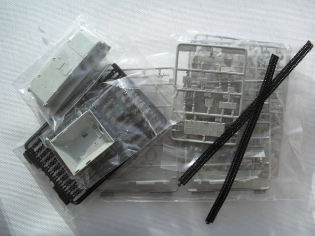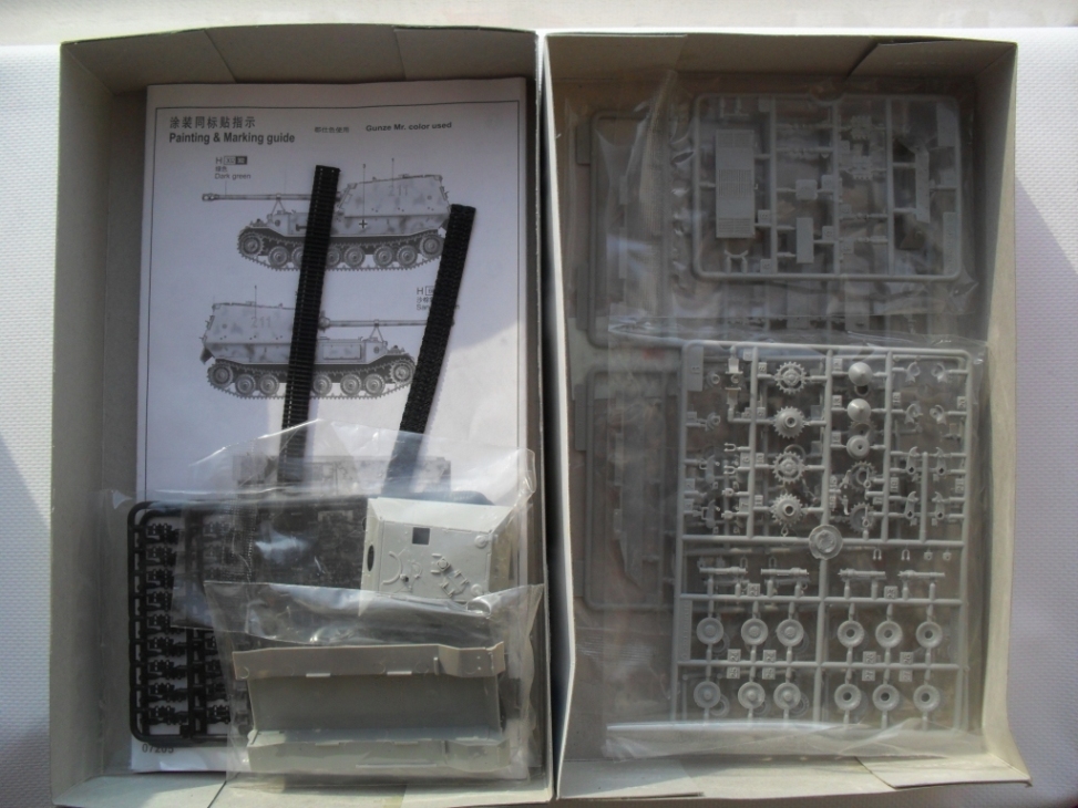 В стандартную картонную коробку помещены четыре рамки с деталями, рубка и ванна корпуса. Гусеничная лента на выбор гибкая пластиковая или наборная с прямыми участками, выполненными единой деталью. Пресформы используются с 2003 года и еще не разбиты. Облой присутствует в минимальных количествах. Утяжин и непроливов нет. Стыкуемость деталей хорошая. Для разнообразия присутствуют следы толкателей на крыльях, но они легко убираются. Особое внимание необходимо уделить сборке ходовой, её качество сводит на нет все первоначальное хорошее впечатление от набора.