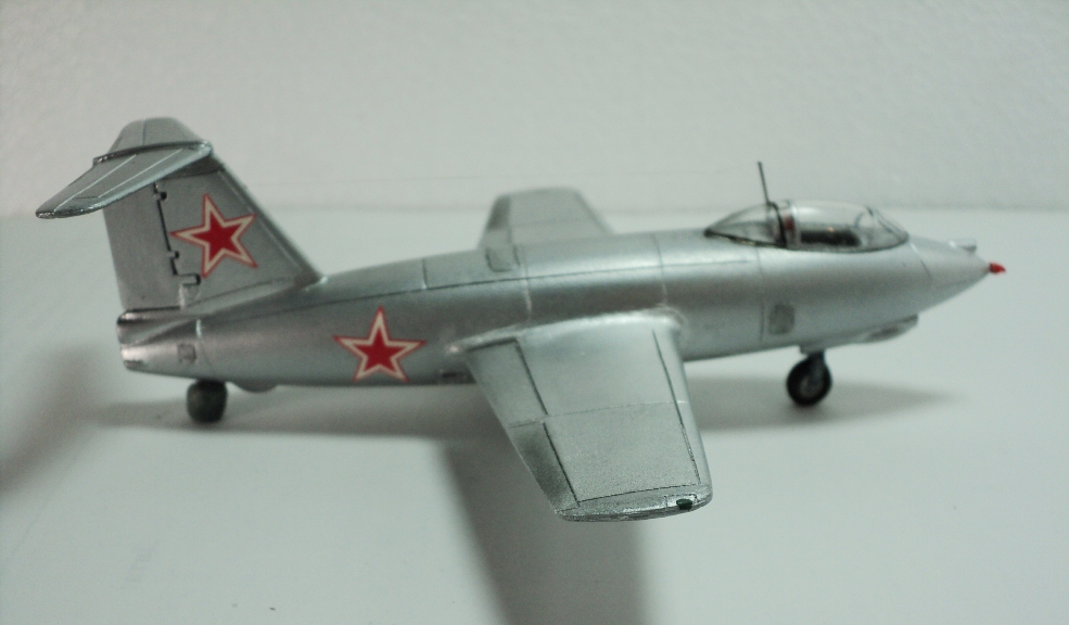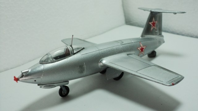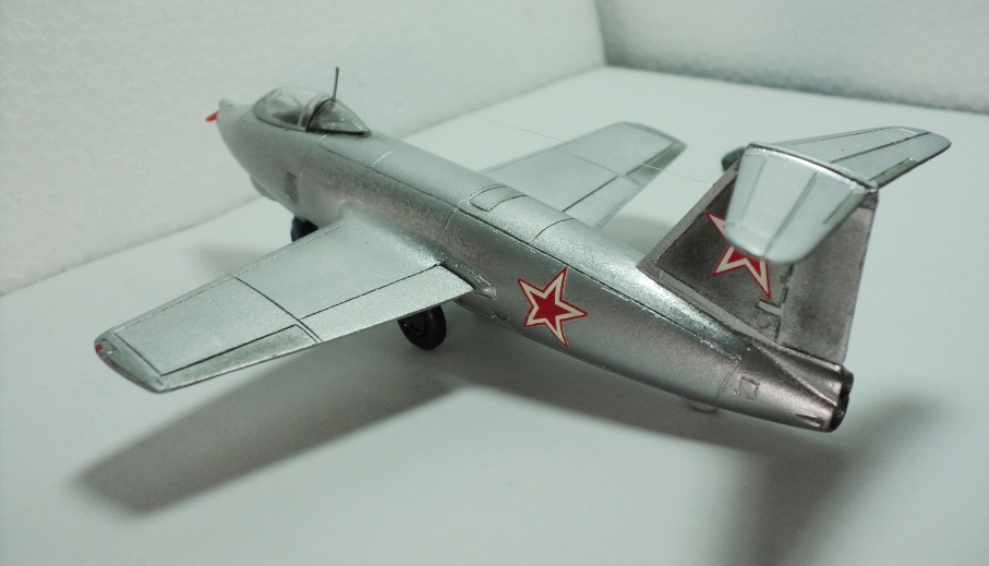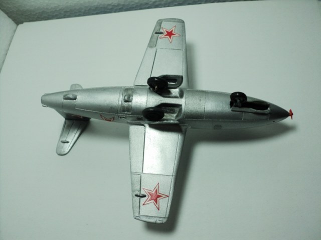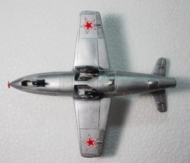 По прототипу: другое название самолёта экспериментальный истребитель И-270. Построен ОКБ Микояна в 1947 году. Было изготовлено 2 штуки (Ж-1 и Ж-2), оснащённые ракетными двигателями. Амоделовское изделие больше похоже на Ж-2, хотя в нём было что-то от них обеих. Ж-1 нужно больше дорабатывать и сложнее красить (цвет – окисленный алюминий), так что я пошёл по наименее трудоёмкому пути.