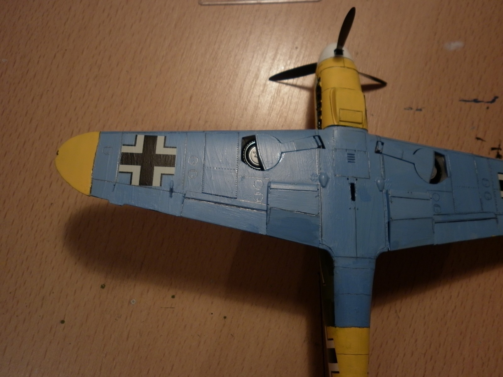 Вот мой первый 48-ой мессершмитт. Сама модель весьма качественная, отливки супер. Правда пришлось отказаться от двигателя, т.к. из-за него не закрывался капот. Зенитка и "поле" тамиевские, краски тоже за исключением телесного. Расшивка простым карандашом :D