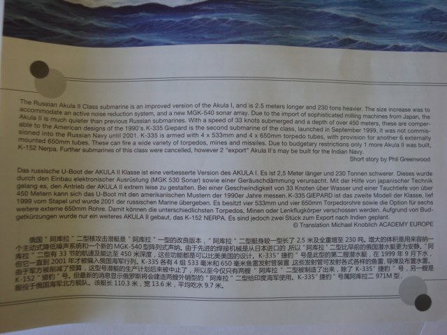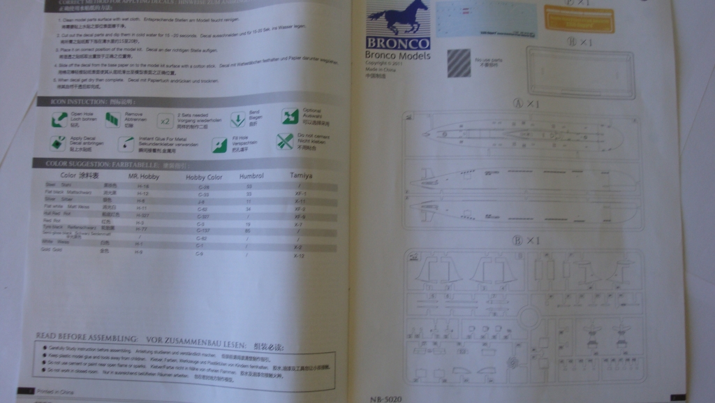 В плотной коробке лежат 4 пакета и инструкция на 4 листах А4. Инструкция довольно хорошая, с цветными картинками и неадекватной историей-сказкой товарища Фила Гринвуда (любопытно, на какие источники информации он ориентировался, когда писал эту... сказочку?). В первом пакете лежат половинки корпуса, поделенные на три части, верхняя (удобно для диорамы для версии по ватерлинию) и две половинки нижней части лодки. Литьё хорошее, правда мне попался набор, в котором в кормовой части рубки есть утяжина, ну да ладно, не это главная проблема. А проблема собственно в том что рубка ниже, на 2,5-3 мм чем она должна быть и немного короче. Носовая часть (обтекатель ГАК) у Бронко вышел каким-то тупым ( повторяется ошибка Алангера с их 971-ым), писать что у модели не на своих местах и не попадает в чертежи очень просто: у неё ВСЁ не на своих местах, да-да, ни на корпусе, ни на рубке, ни один шпигат и ни одно отверстие не попадает в чертежи (я использовал чертежи Дилетанта, выложенные им на форуме Авиабазы). Во втором пакете лежат элементы СОКС, водозаборники (непохожие на настоящие и слишком уж плоские), подруливающие устройства (имейте в виду, что на корпусе разметка под подрули неверна), ВУ, носовые и кормовые рули (кстати носовые рули слишком большие, а кормовые немного неправильной формы), элементы подставки (тут уж претензий нет) и винт (немасштабен и такое впечатление что лопасти повернуты наоборот...). В третьем пакете лежит отдельно основание подставки, а в четвертом листок с декалями и маленькая плата фототравления, на которой даны леера рубки и надпись для подставки. Кстати и в названии набора Бронко ошибся, на коробке и плате травления для подставки пишется что "Гепард" это Akula ll, тогда как "Гепард" единственный представитель класса Akula lll.