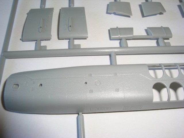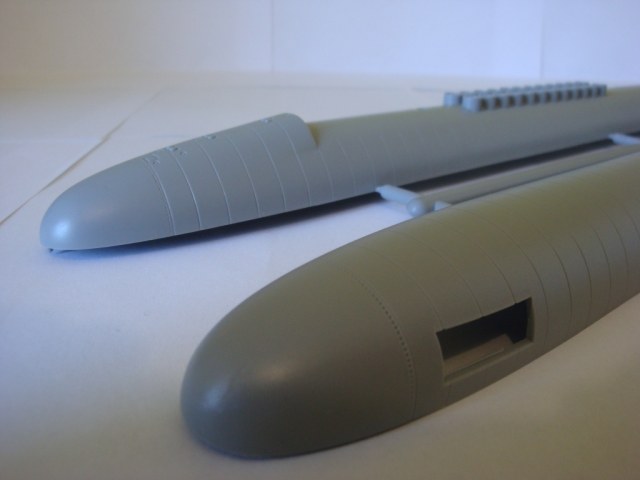 В моем наборе пластик корпуса был очень толстым, тонким был только горб. Расшивку секций, после изнурительной шпаклевки и шкурежки, прорезал, в месте склейки, по новой, чем и исправил легкую нестыковку линий.