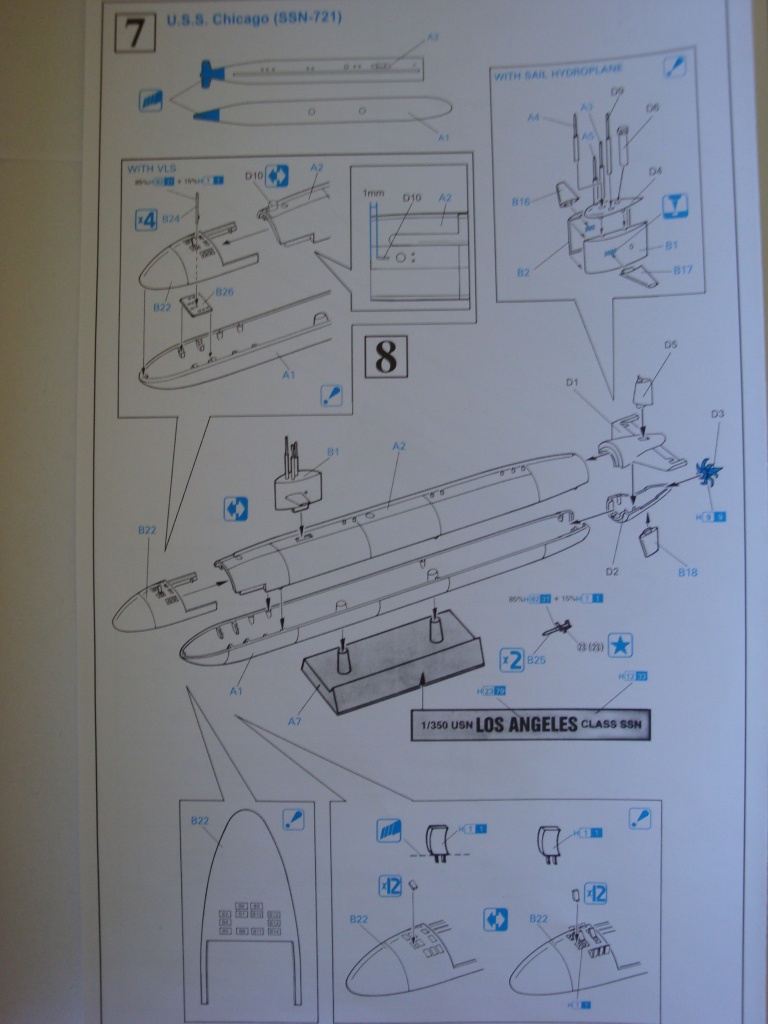 Упакованы модели в плотный картон, причём в отличии от многих современных моделей я был поражен тем что большая коробка и вправду была почти забита внутри кучей литников в отдельных пакетах ( у многих производителей подлодок в коробку от модели можно засунуть ещё как минимум одну модель, место позволяет). Инструкция выполнена в виде раскладывающегося листка, довольно внятная и с цветными картинками. Теперь к собственно пластику. Начнём с того что в коробке лежит продукция Dragon, точнее 2 их набора, которые можно приобрести и по отдельности. Сами лодки довольно старые, выпускаются давно, никакого травления нет (в то время когда производитель начал выпускать эти наборы траление ещё в моду видимо не вошло так как сейчас), однако многие мелочи приятно радуют и без этого. Например, кроме самих лодок в наборе так же присутствуют 2 вертолёта Sea Hawk, а в лодке класса "Огайо" весьма хорошая проработка ракетных шахт, 2 разных типа баллистических ракет (Trident 1 C-4 и Trident 2 D-5, каждой по две штуки, остальные шахты отлиты с иммитацией ракет, причём на все шахты даны "колпаки", не знаю правильного названия, вобщем специальные защитные крышки т.к. Trident запускаются из сухой шахты и пробивают эти самые колпаки, приятно что производитель подумал об этих мелочах ), производитель даёт возможность сделать открытые ТА и люки на палубе ПЛАРБ. В чертежи "Огайо" ещё не вгонял ввиду отсутствия хороших чертежей на неё, но на фото оригиналов модель похожа, винт правда вызывает сомнения, но фото винтов "Огайо" я не видел. Далее, вторая модель в наборе, АПЛ класса "Los Angeles" в модификации VLS. Удивительно, но, несмотря на возраст самого набора, он неплохо вписался в чертеж Дилетанта (правда на первую модификацию Лося), в наборе вобщем-то лежит именно первая модификация Лося, носовая и кормовая части даны отдельно (и слава Богу, потому что изначальная кормовая часть которая отлита с корпусом вообще неправильная), порадовало то что крышки ПУ ракет Томагавк можно сделать открытыми, более того, в наборе и сами ракеты имеются. Правда производитель ошибся, в крайнем ряду шахт по 2 с каждого борта, и по 4 в центральных двух рядах, а у производителя на модели идёт по 3 шахты в каждом ряду, кроме того сравнение с фото конкретно прототипа (USS Chicago) выявило отсутствие 4 шпигатов с обоих бортов рядом с крышками ПУ. Рубка (или парус, кому как больше нравится) лодки выходит немного длинее, где-то на 1 мм, что вобщем-то в глаза не бросается. Непонравилось то что рубка практически "чистая", можно было бы расшивкой показать всякие лючки и прочую мелочь. Это же касается и корпуса, на котором кроме ТА (неправильных) больше ничего и нет, хотя бы кингстоны можно было показать. Винт в наборе по давней традиции производителей моделей неправильный. Декали разместились в отдельном пакетике, порадовало изображение быка для носового обтекателя, данный рисунок имел место на USS Chicago в 1993 году и был нанесён во время промежуточной профилактики и ремонта в базе АПЛ в Сан Диего по случаю победы комманды Chicago Bull's в чемпионате NBA.