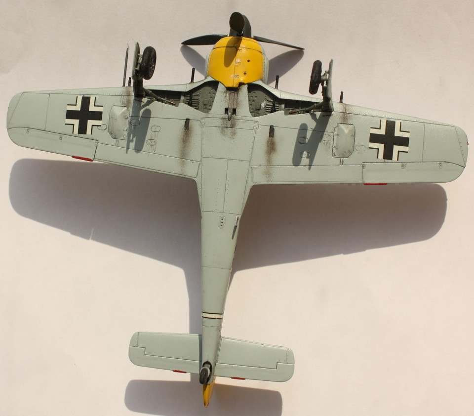 Собирал с минимальными доработкаи - выхлопные патрубки из латунных трубок, колёса - "Экипаж". Трубопровод тормозной системы на стойках шасси - медная проволока. Пушки - инъекционные иглы. Раструбы на MG FF точил надфилем.