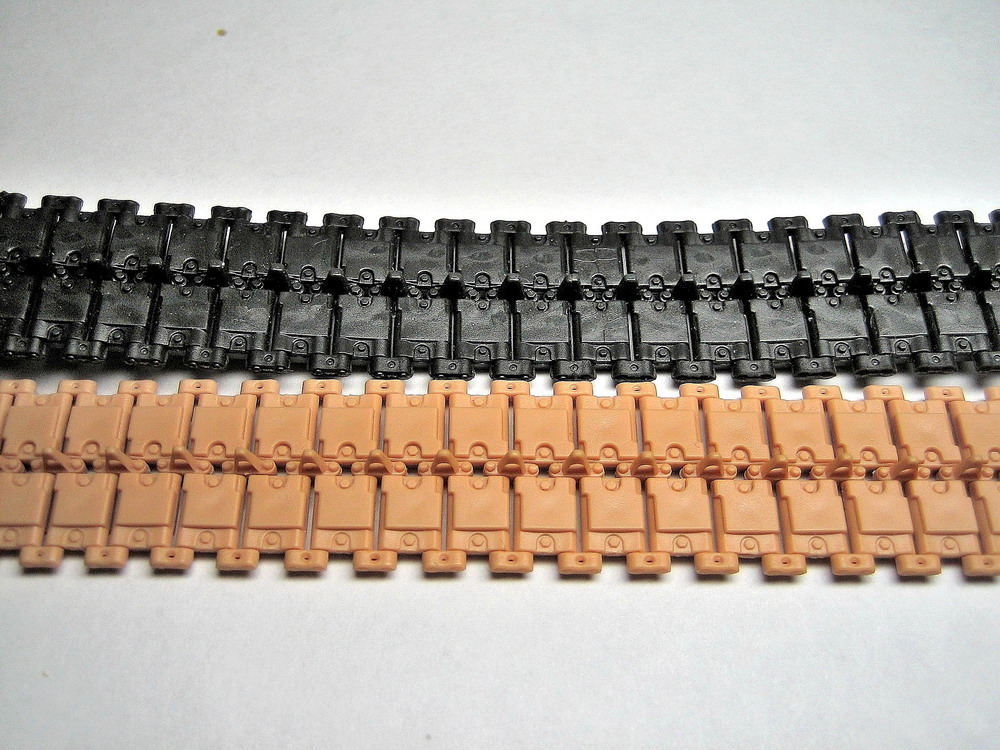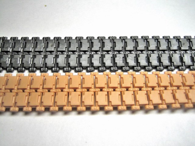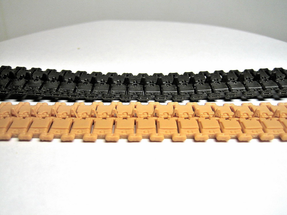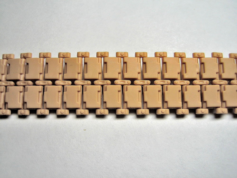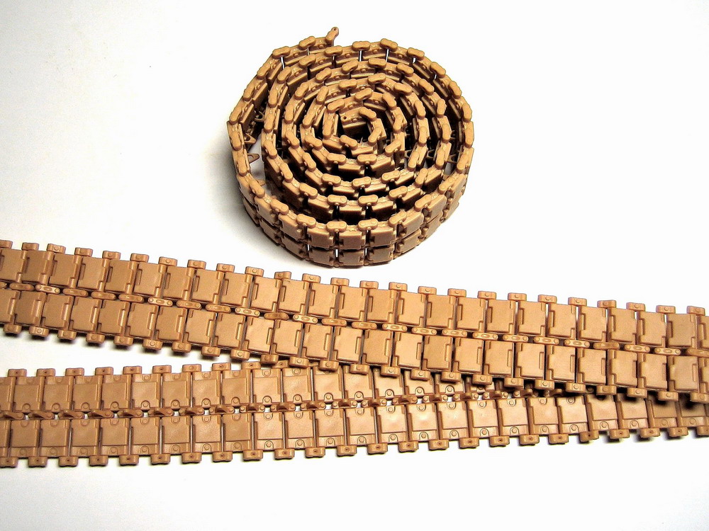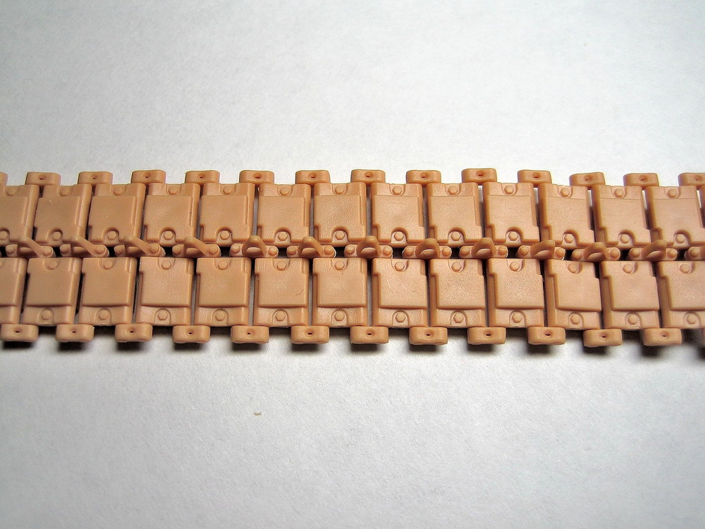 В стандартной бронковской коробке находятся 6 литников пластика светло-коричневого цвета. Облоя, утяжин, следов толкателей и прочих расстройств не обнаружено. Качество традиционно на высоте. На каждом литнике детали для сборки 24 траков. Нижние и верхние половинки выполнены по отдельности, гребни также отлиты отдельно.