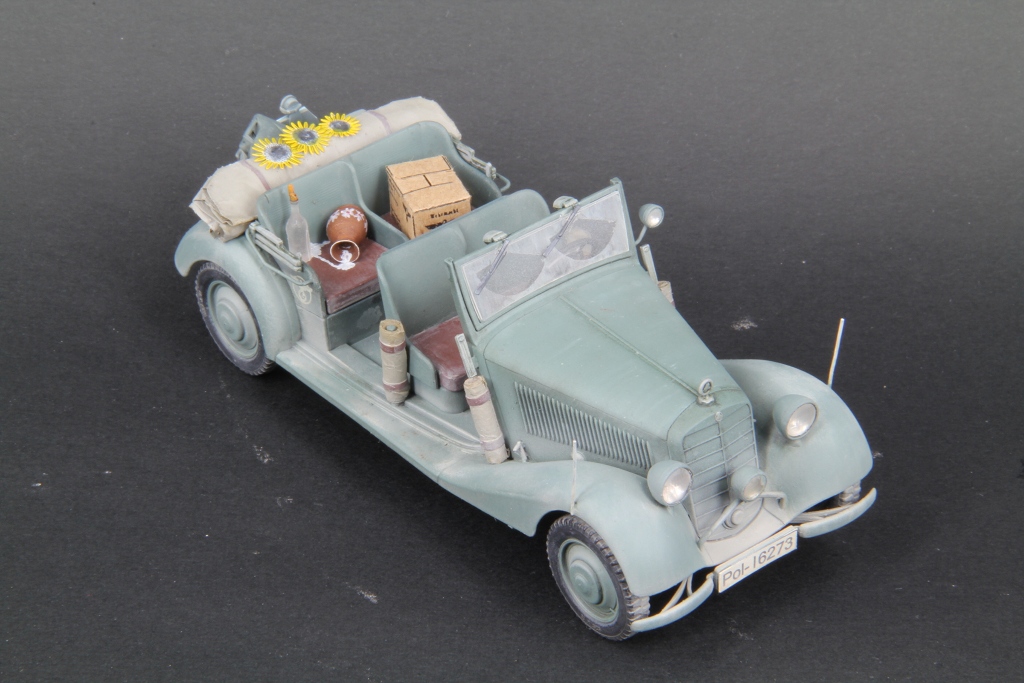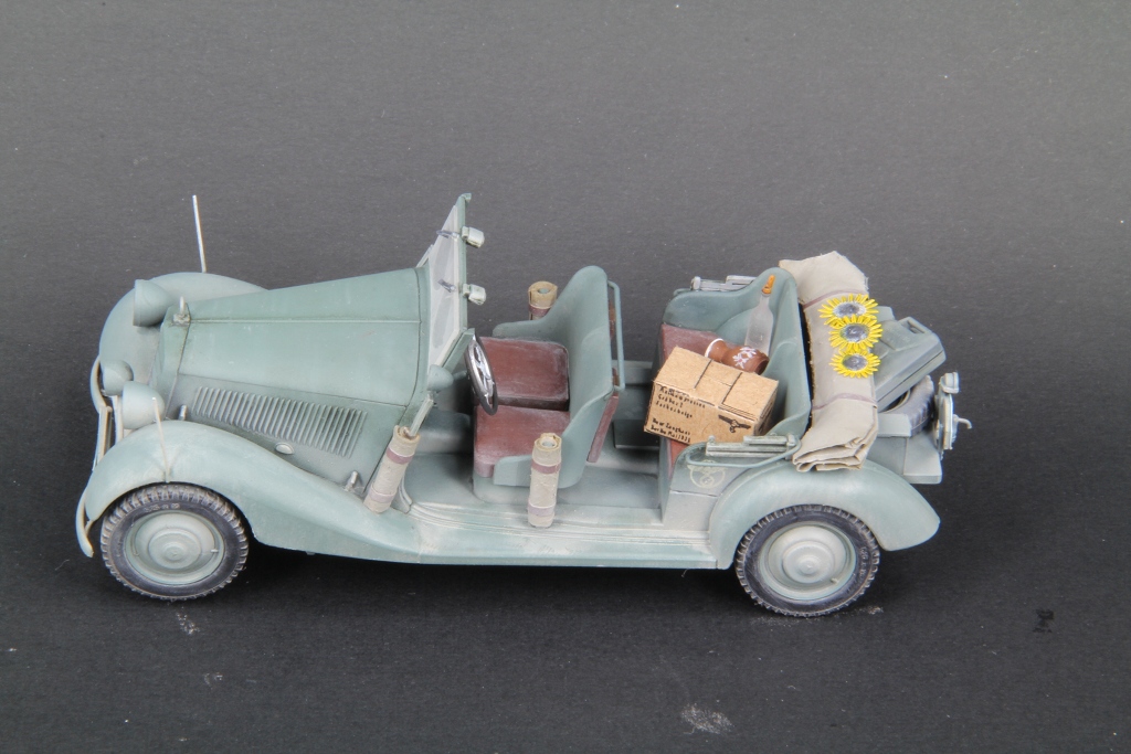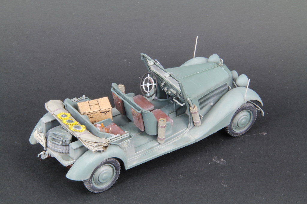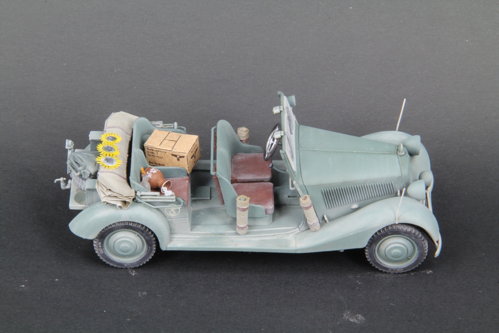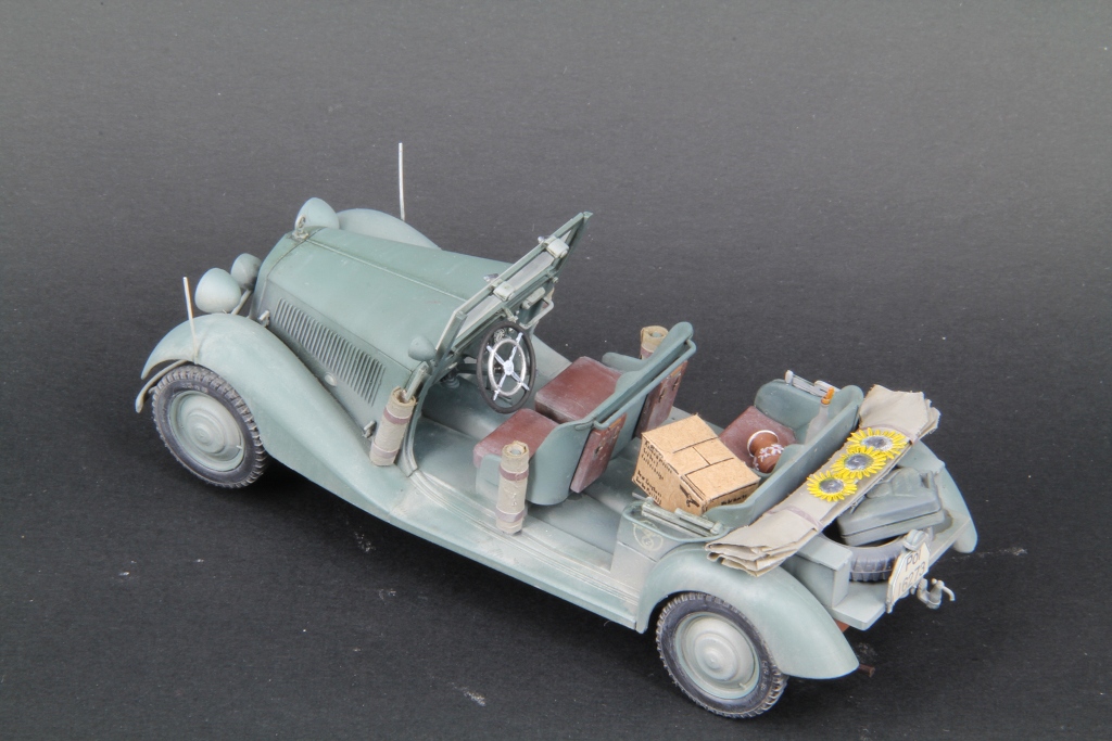 С негатива начну, жуткая инструкция, далее по собираемости очень приличный кит. Очередная попытка сотворить подобие тента. По окраске Tamiya, Vallejo. Везеринг AK, Mig. Набивка кузова различные наборы Voyadger, Condor. Фары Elf. Вроде все.
