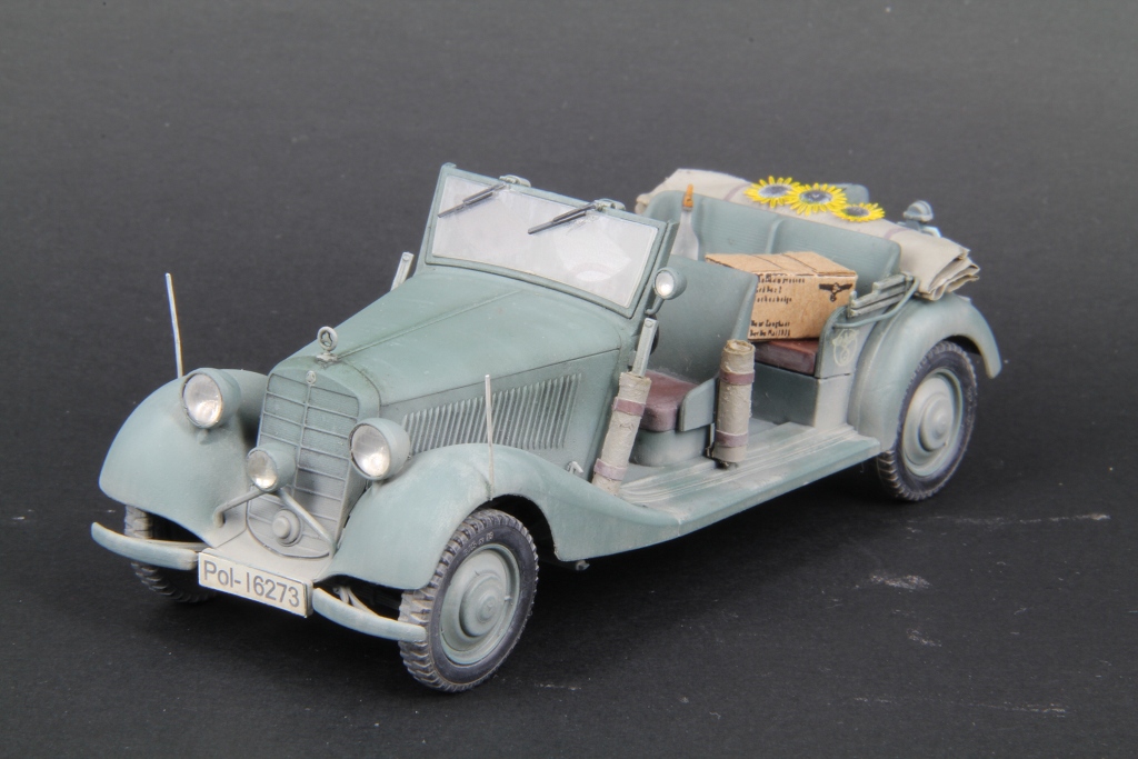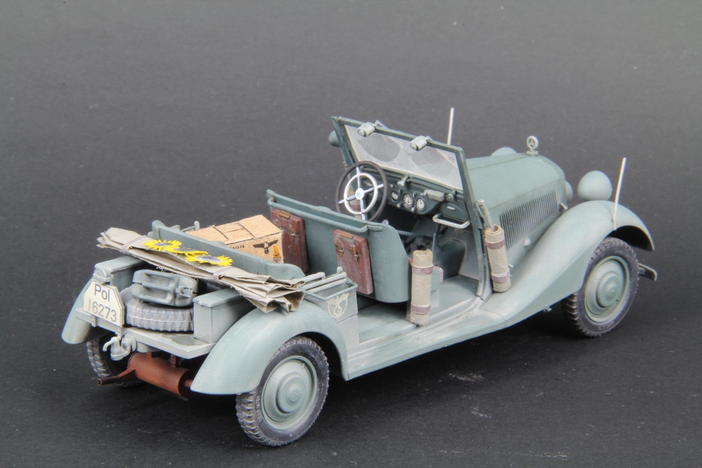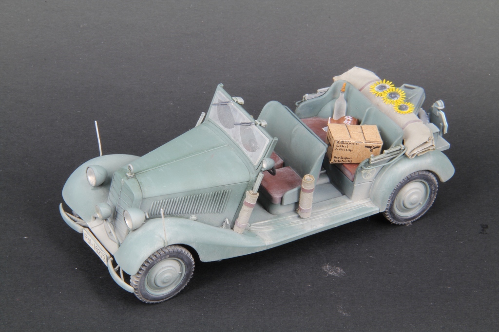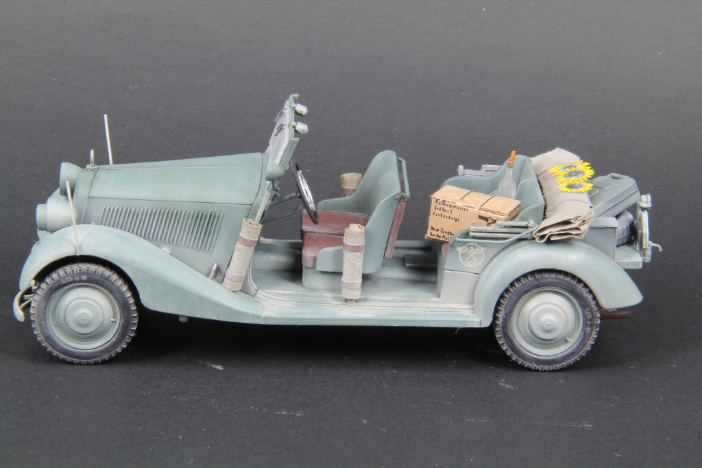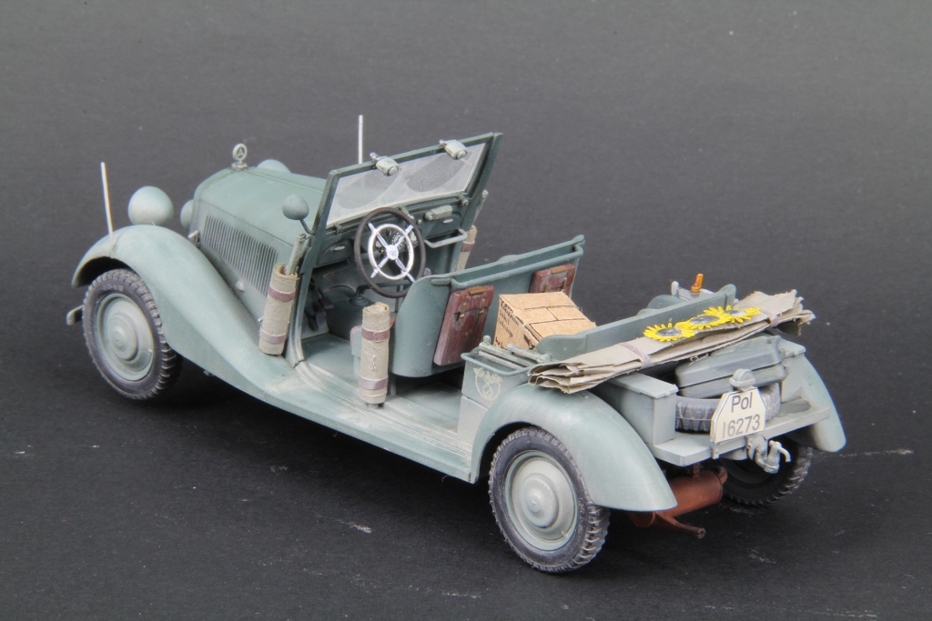 С негатива начну, жуткая инструкция, далее по собираемости очень приличный кит. Очередная попытка сотворить подобие тента. По окраске Tamiya, Vallejo. Везеринг AK, Mig. Набивка кузова различные наборы Voyadger, Condor. Фары Elf. Вроде все.