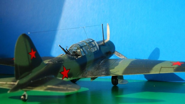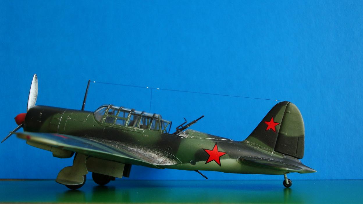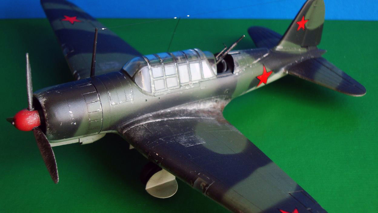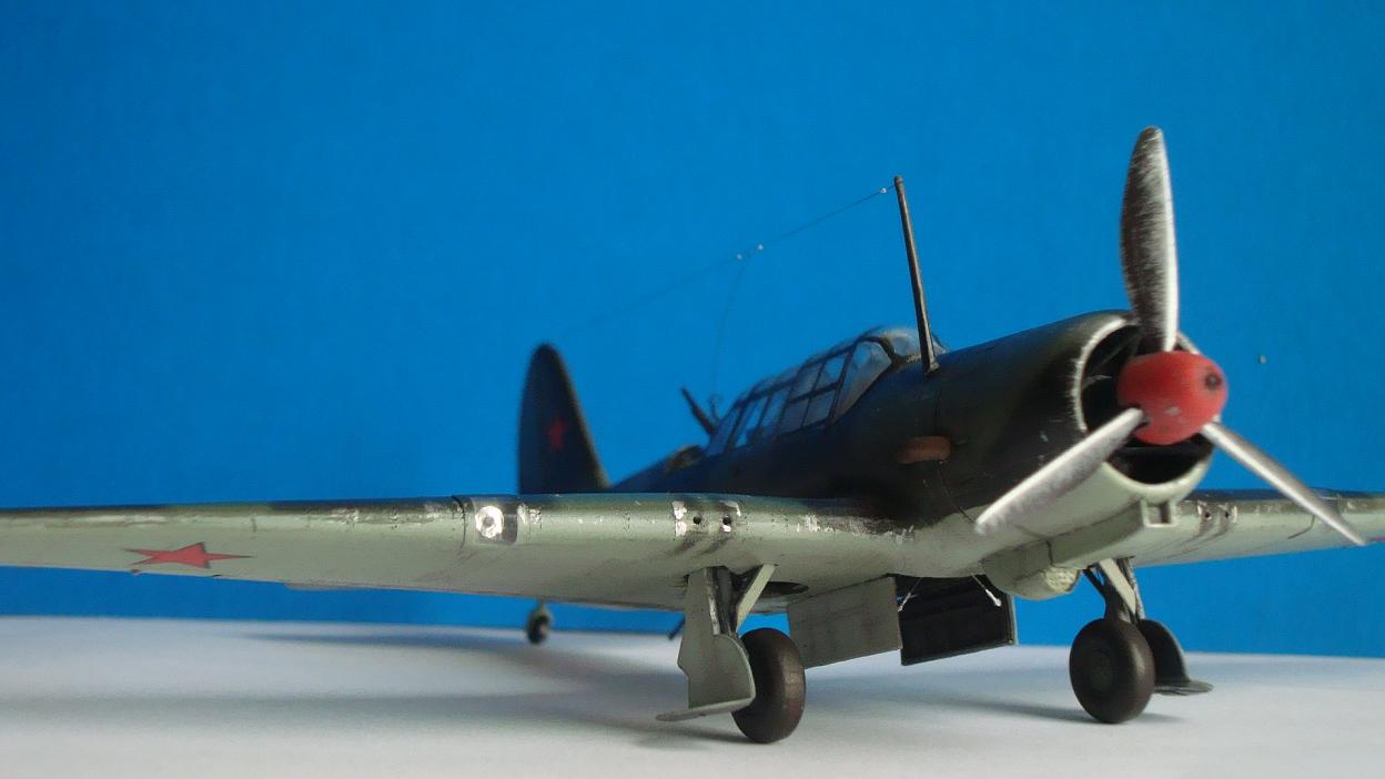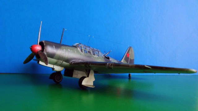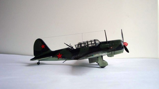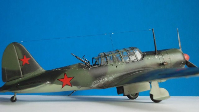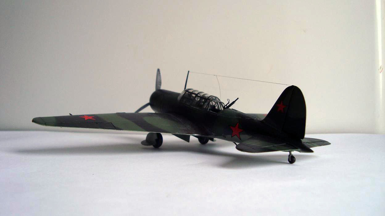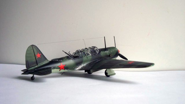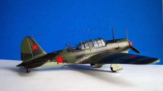 Эта, на вид немного несуразная машина, одна из первых встретила войну и использовалась довольно широкоформатно: и как бомбардировщик и как штурмовик и как корректировщик. Данная модель представлена как вариант бомбардировщика с модифицированной турелью. Впоследствии, полноценной замене Су-2 стал Ил-2, который летал до самой Победы (если поглядеть на Су-2 сверху, - можно даже узнать знакомые линии крыльев, оперения. Не удивительно, что фрицы часто путали эти аппараты).