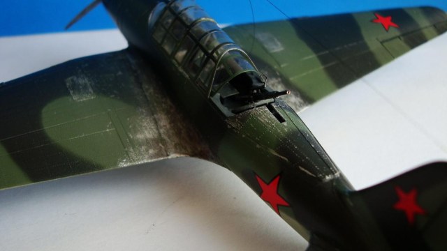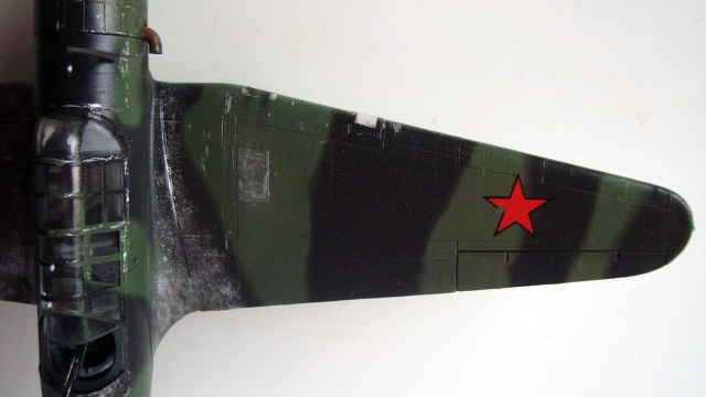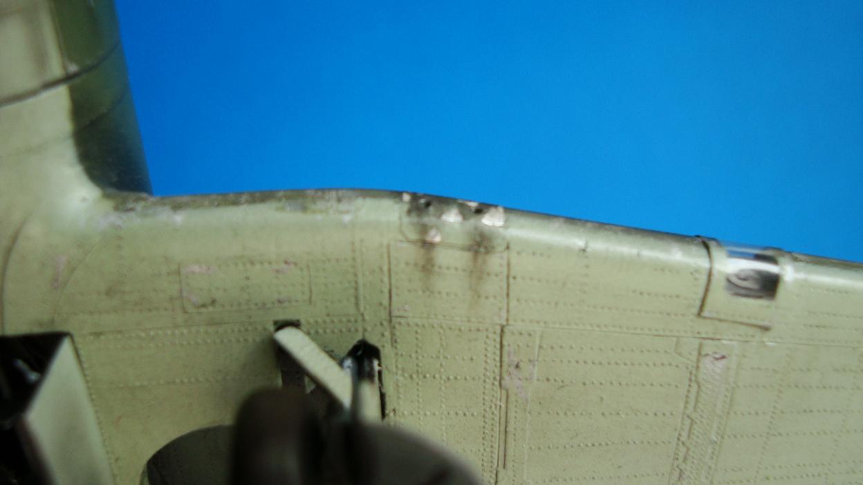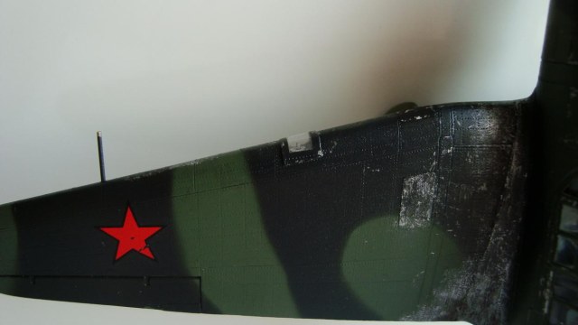 Черный камо наносился преимущественно в полевых условиях поверх зеленого АМТ-4, потому при царапании подошвами сначала стиралась верхняя краска(черная), потом зеленая, потом грунт. Поэтому зона вытертости на левом крыле у центроплана должна смотреться более зеленой, что ли, чем окружающее черное покрытие.