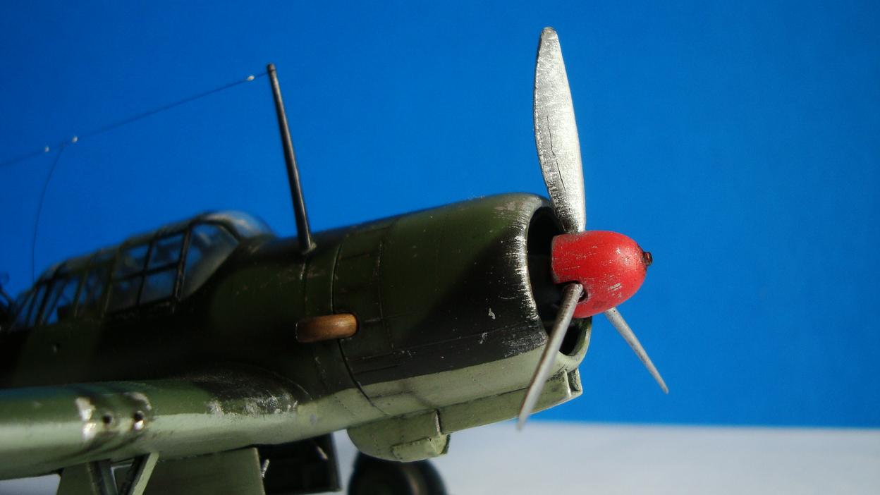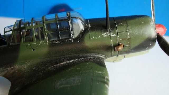 Здравствуйте. Немного по мат. части - на серийных самолетах фюзеляж и крылья делали деревянными(если верить Гордюкову и Маслову),поэтому сколы до металла на крыльях не уместны.Также на сер. самолетах стояли винты ВИШ-23 - винты из набора ICM - совершенно не похожи.Также в книге Гордюкова и Маслова "Су-2" предоставлены сведенья, что было решение сократить вооружение самолета на два крыльевых пулемета,но это конечно спорно-с началом боевых действий могли и скорее всего ставили.По нишам шасси - нигде нет более - менее вразумительных фото.Но в упоминаемой выше книге есть фото боковых ракурсов-видны по крайней мере два окошка(возможно это фото прототипа СЗ-3).Я сам сейчас собираю эту птицу - поэтому так подробно пишу.Чтобы не быть голословным прикреплю пару файлов.А у Вас получилось классно.Понравилась окраска,а антена - супер.Эдик.