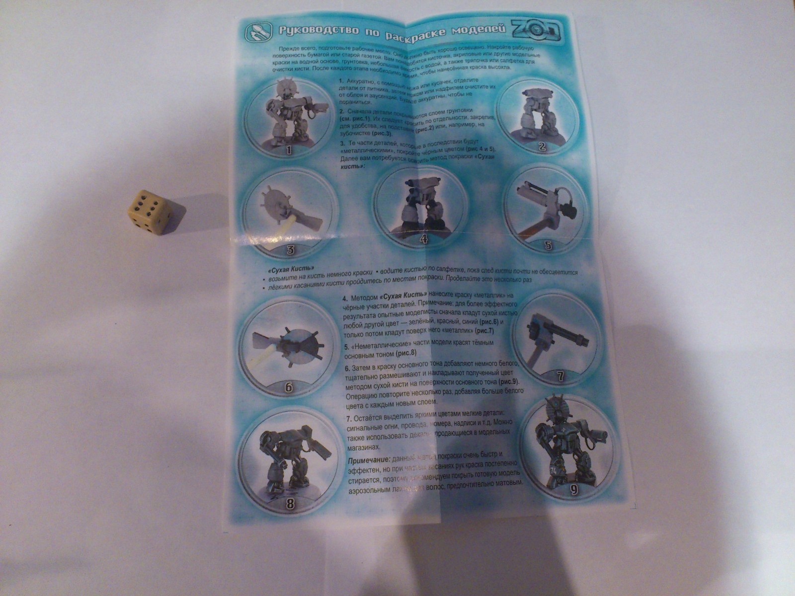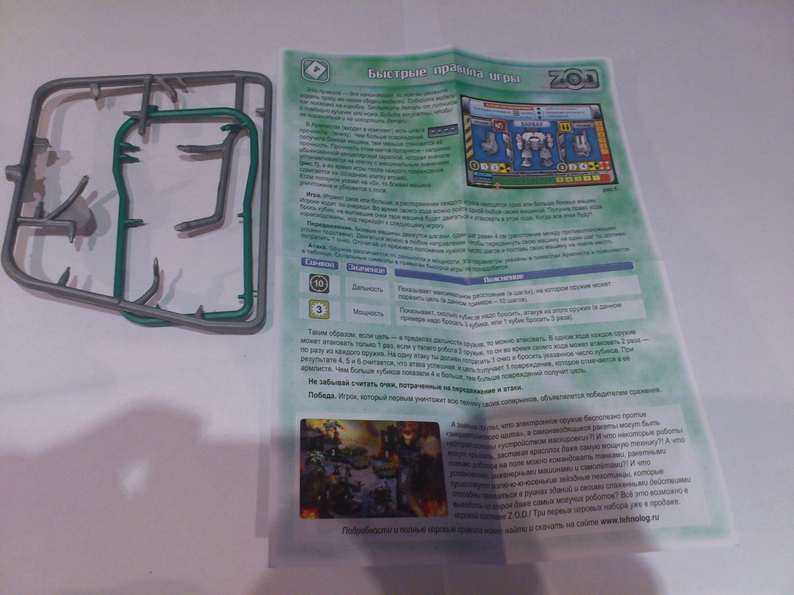В небольшой коробке лежали два литника, корпус робота, две подставки, правила игры и кубик.