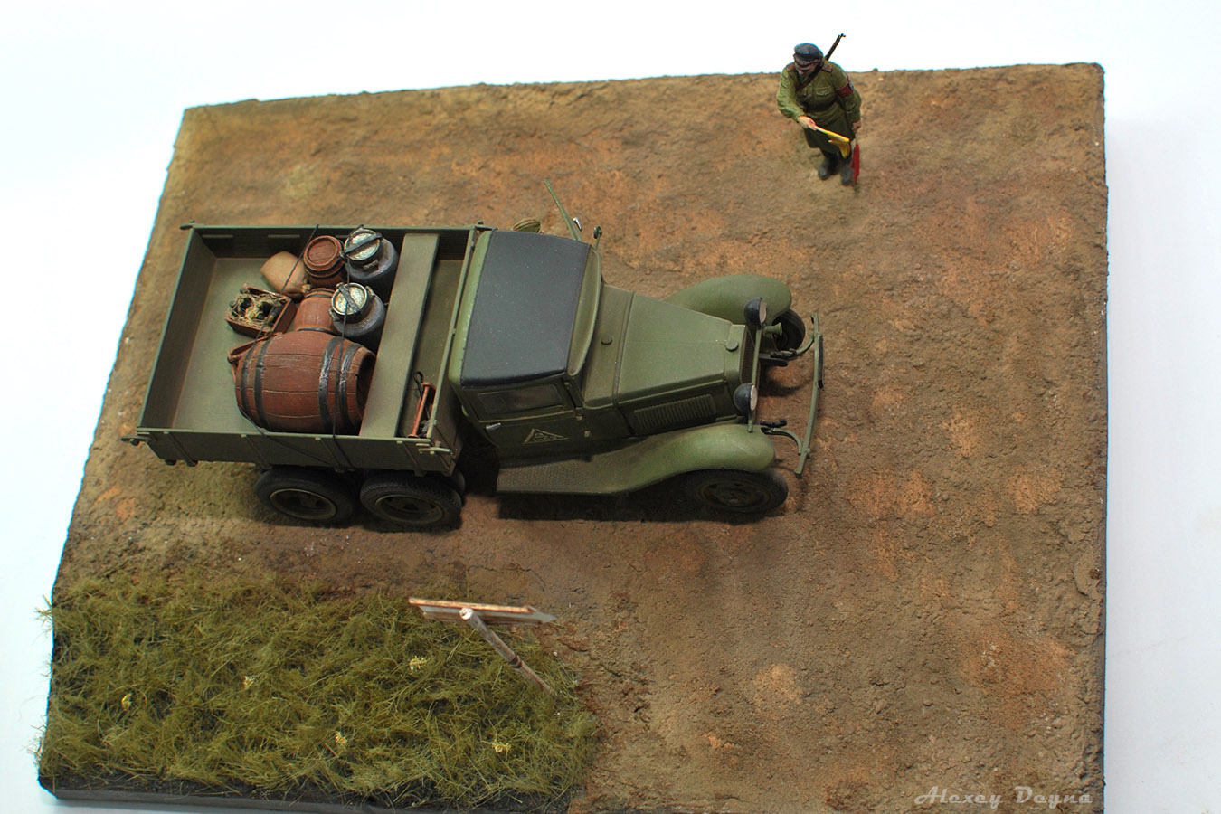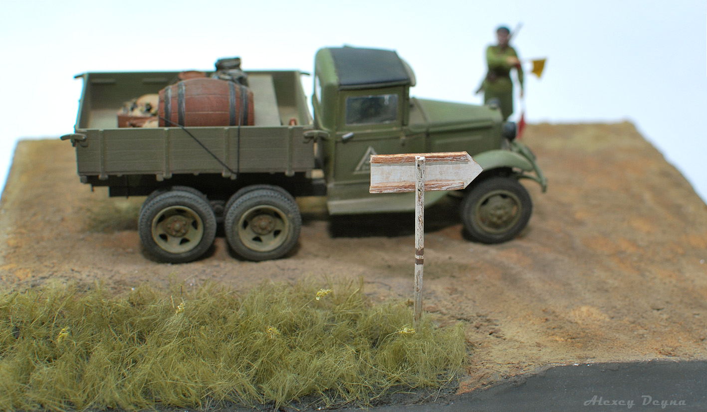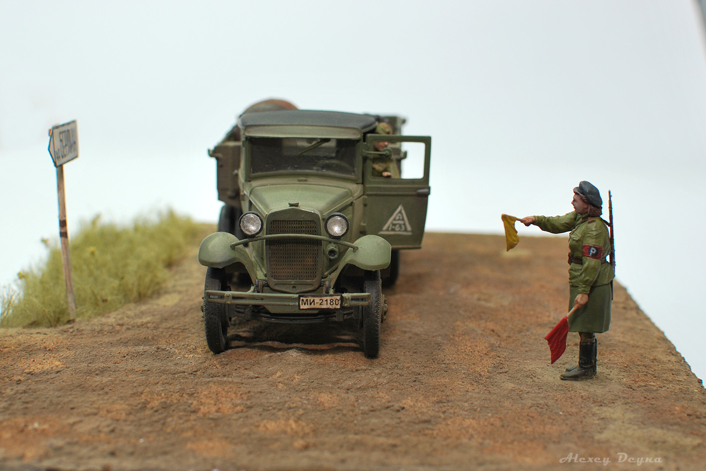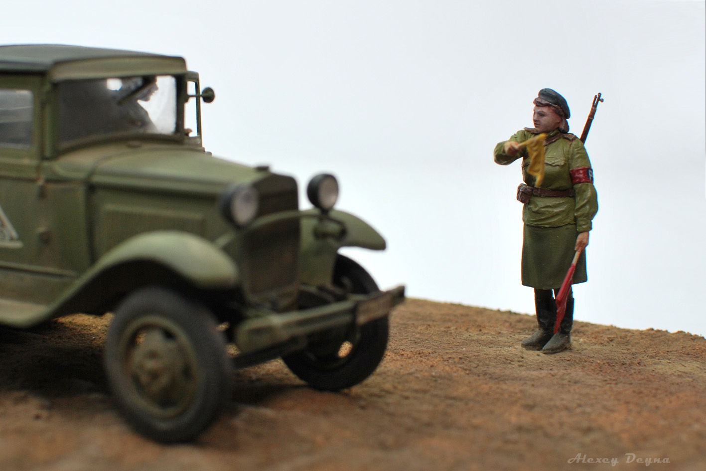 Подаренная коллегами моделька от Звезды Газ ААА да просмотренные Халдеевские фото фронтовых дорожных регулировщиц навеяли сюжет диорамы: шофер грузовика хотел комплиментом одарить девушку, а она только флажком указывает на путь следования.
