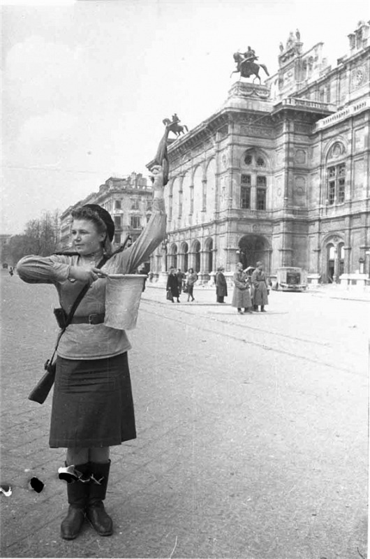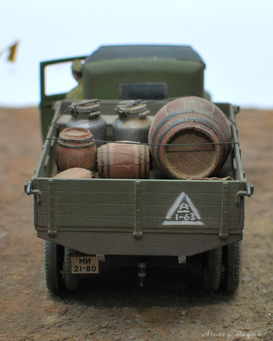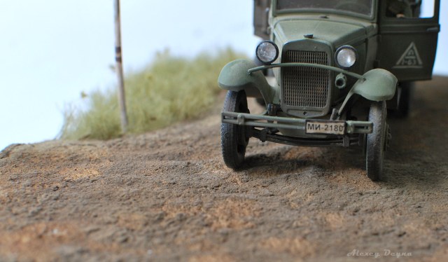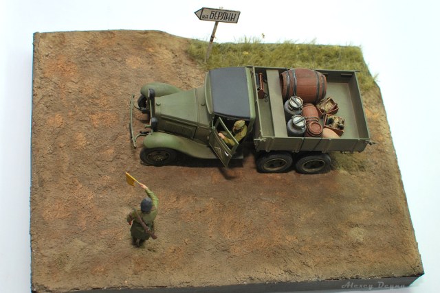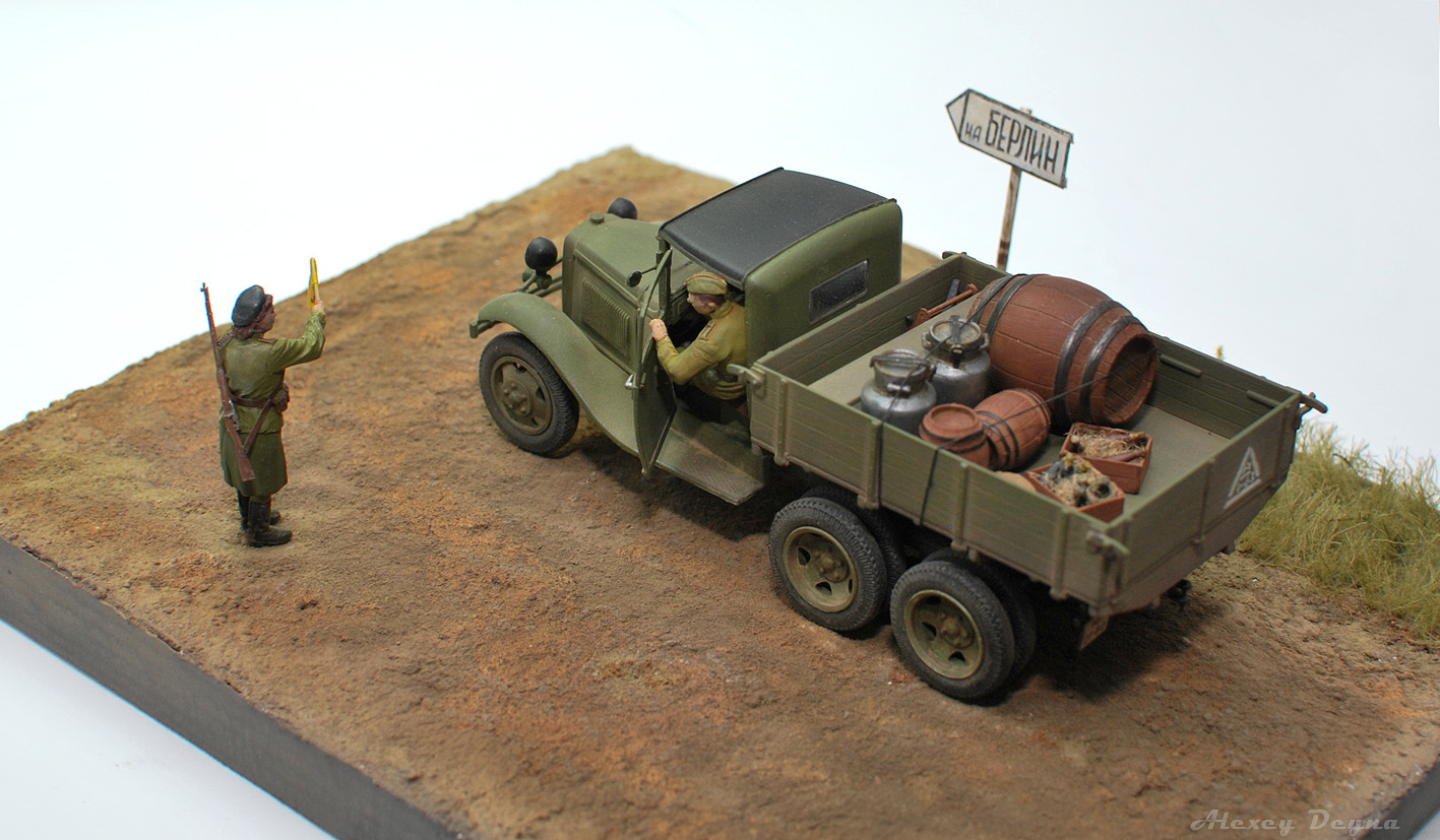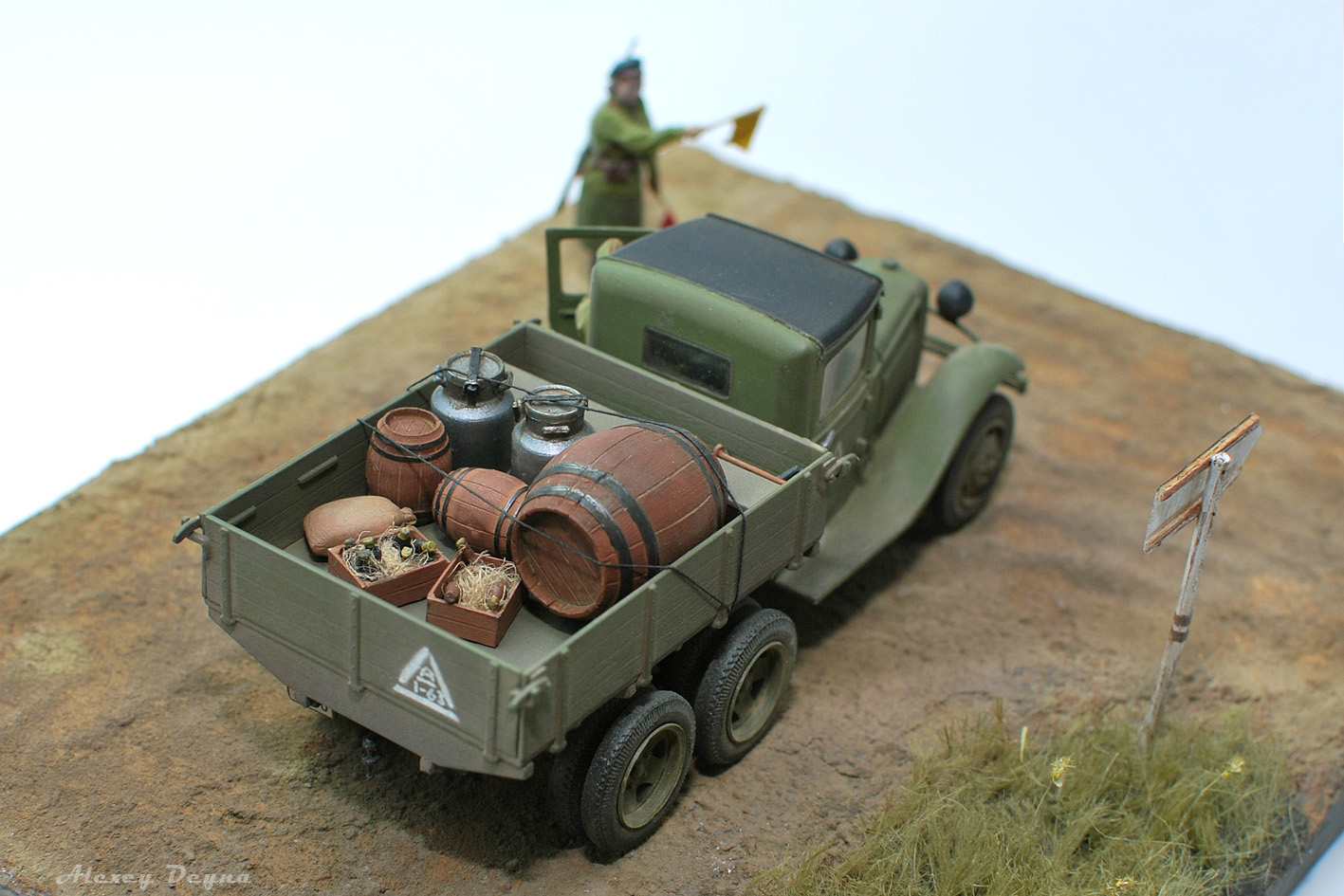 Подаренная коллегами моделька от Звезды Газ ААА да просмотренные Халдеевские фото фронтовых дорожных регулировщиц навеяли сюжет диорамы: шофер грузовика хотел комплиментом одарить девушку, а она только флажком указывает на путь следования.