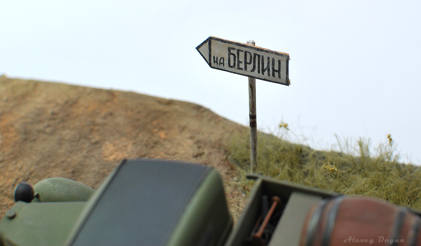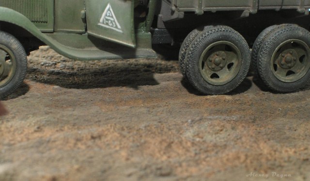 Что дополнительные действующие лица оживят, согласен. Сам думал об этом, фигуры еще есть. Но композиционно они не вписываются. Можно возле дорожного указателя, но тогда те пехотинцы будут оттягивать внимание на себя от основного диалога шофера и регулировщицы. Пустить пехоту за спиной девушки в направлении, противоположном движению грузовика, они будут на самом краю диорамы. Короче, вроде и свободного пространства осталось много, а портить композицию не хоцца. Просто теперь понимаю, что нужно было подставку на пару сантиметров уже делать. Подумываю еще противотанковый ежик на обочине возле указателя поставить.