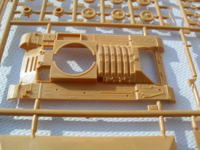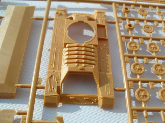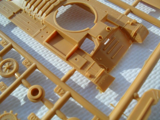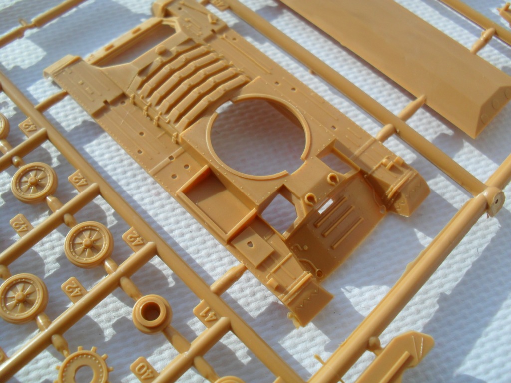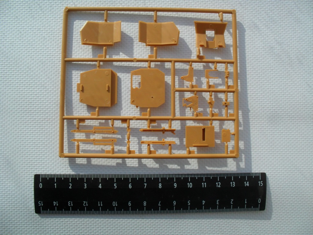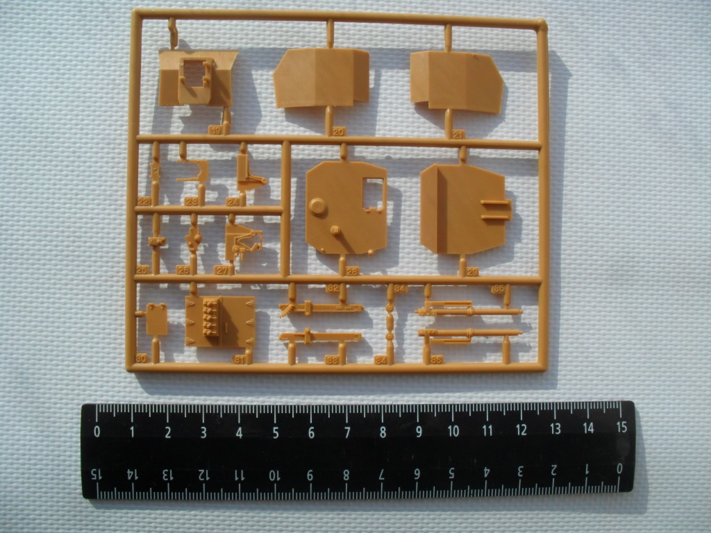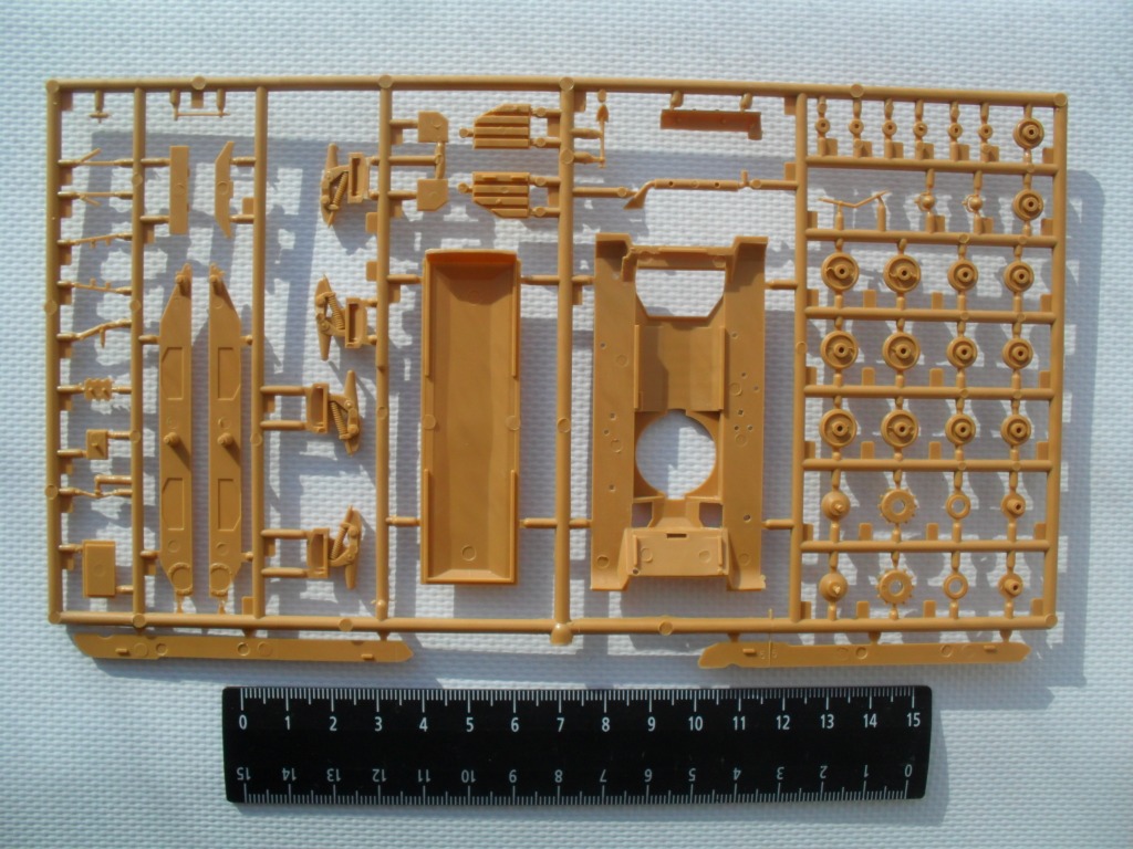 На двух литниках светло-коричневого цвета размещено 79 деталей для сборки корпуса САУ. Пластмасс мягкий и в меру гибкий, при отделении от литника не должен ломаться и давать сколы, легко обрабатывается. Имеется незначительный облой, утяжин и недоливов нет. Хотя производитель и пытался спрятать следы толкателей, они все-таки присутствуют на элементах ходовой и опорных катках. Бросается в глаза не маштабная толщина крыльев и боковых экранов. В целом качество литья хорошее, мелкие детали проработаны четко.