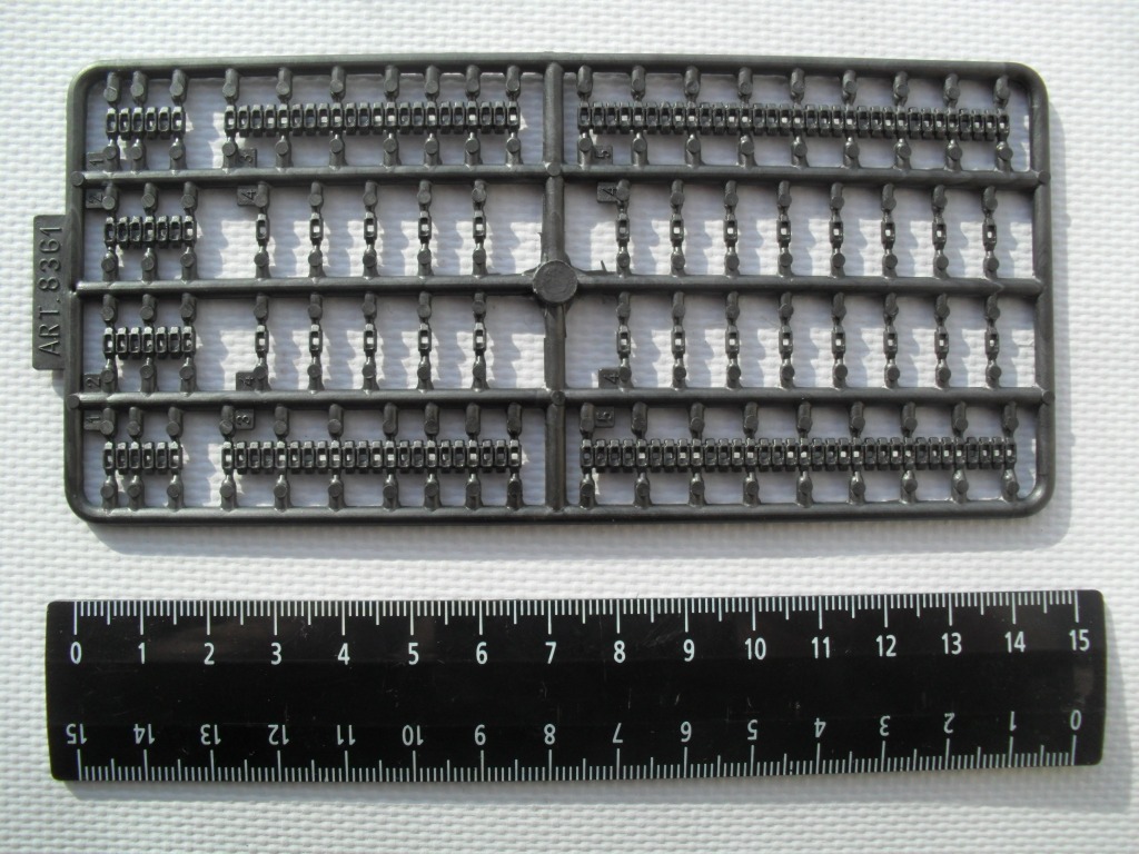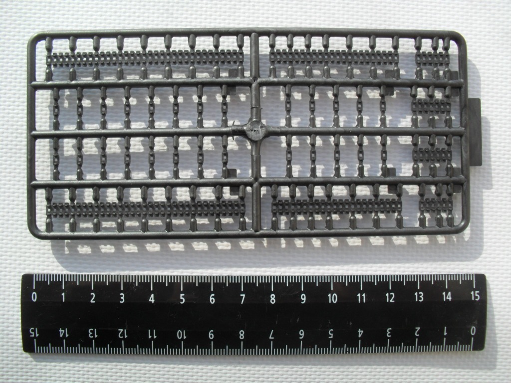 На отдельном литнике цвета вороненого металла размещены 34 детали для наборных гусениц. Имеются прямые участки разной длины из 6,7,22 и 33 звеньев, а также отдельные звенья.