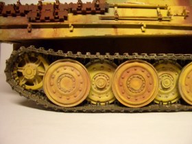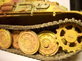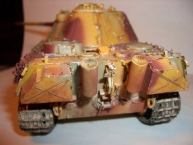 и я про сколы сделаю замечание, т.к. они в натуре страшные и не натуральные, как будто немцы между боями грызли свою машину, тем более если предположить, что она была выпущена, повоевать как следует не успела, и ещё: катки вероятнее всего должны быть на резиновых бандажах, отверстие монокулярного прицела в лобовой броне башни надо заделать, гуси задом наперёд стоят (подсказка, боковые сегменты каждого трака должны смотреть острыми концами вниз, если смотреть спереди), нет рамки под шанец с левого борта, зря не использовали травление набора, баланс белого на фотках не выставлен поэтому про цвета ничего не скажу.