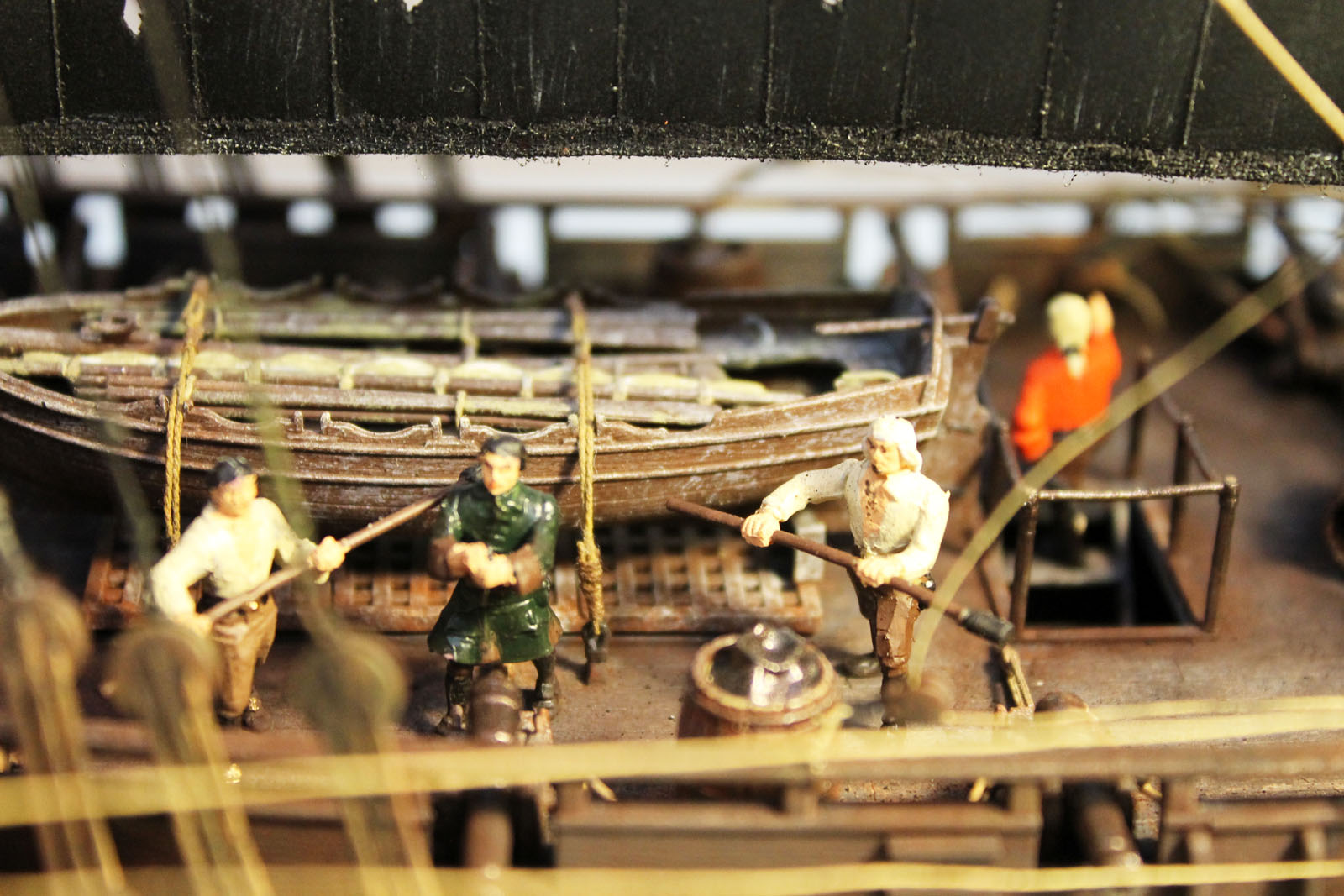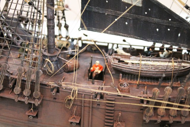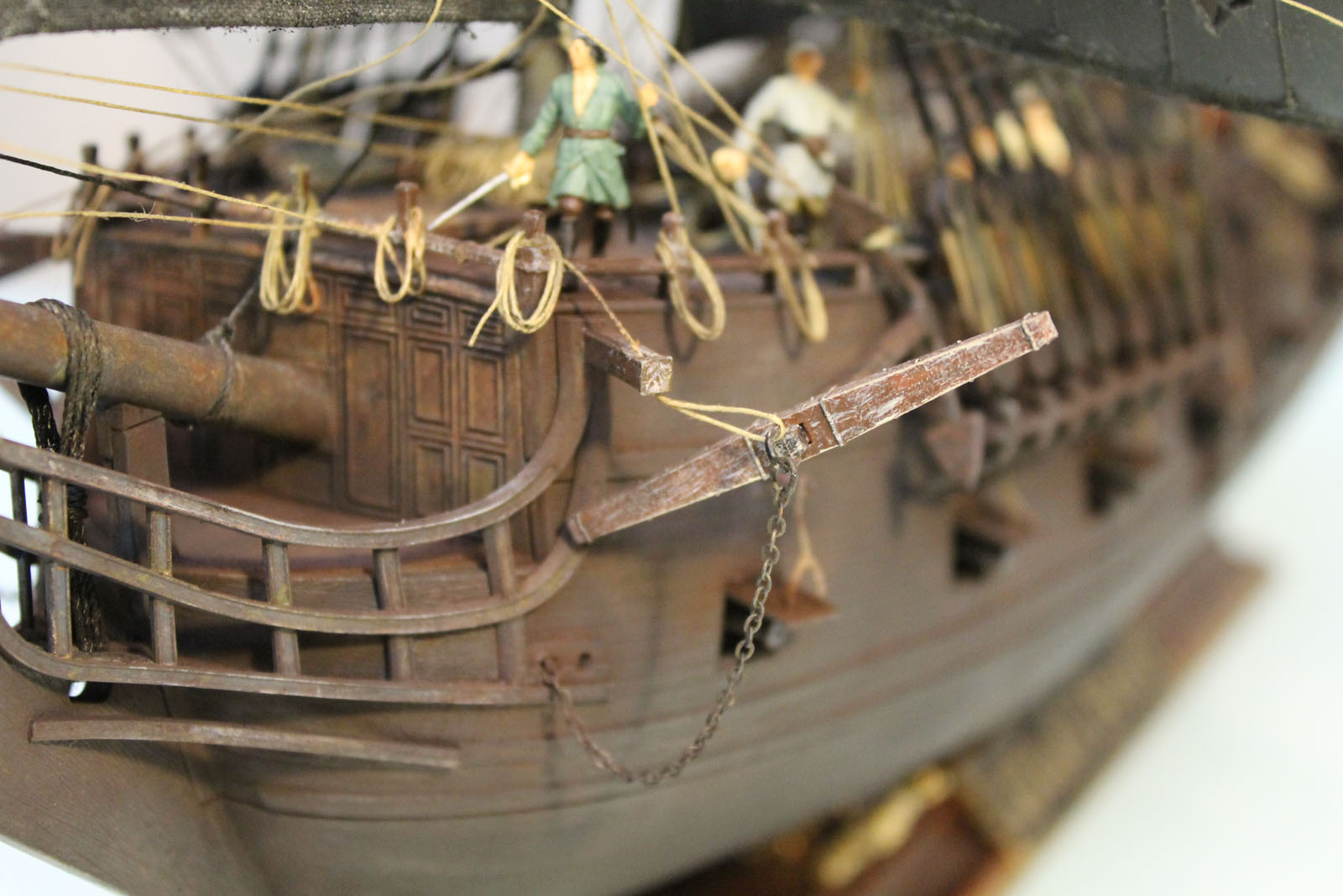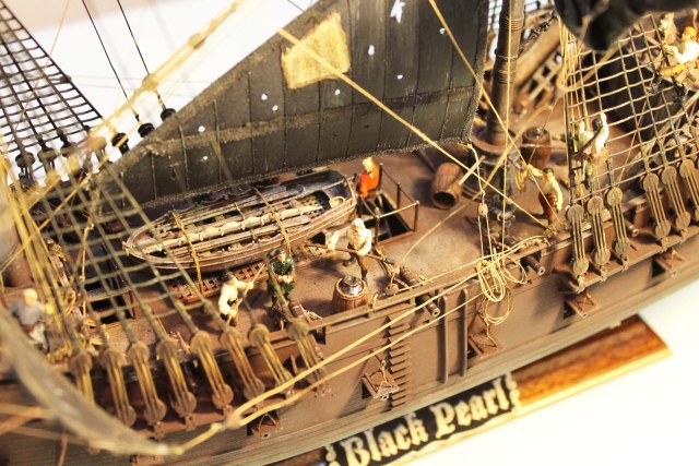 Сразу скажу: идею Александра http://karopka.ru/community/user/12811/?MODEL=240279 не брал за основу. Идея как корабль будет выглядеть, сформировалась сразу при покупке, единственно по окрасу не знал, что получиться. Звезда в данной модели превзошла себя, да и зарубежных производителей. Клеилась спокойно детализация и стыковка хорошая. Единственно клеил долго за это время народ не одну «жемчужину» успел выложить. Склеил и выкрасил стандартно, но не понравилось, как выглядит. Потом случился ремонт и все надолго было отложено. Паруса и такелаж соответственно, переделывал три раза. Хотел сначало на тряпочные заменить, но подумал, что не хватит мат. части, да и с кройкой шитьем проблемы, а готовые мне не понравились. Решил максимум выжать из пластмассовых. Звезда постаралась по толщине парусов в одном месте чут-ли не 4 мм. Второй раз все сделал - бушприт согнулся так, что казалось, что он в середине надломился пришлось переделывать. Сломал его по полам и вставил выточенный металлический стержень. По окрасу с начало был серый со старением потом меня торкнуло прошелся MIG(ким) пигментом причем при фотографировании выявились такие вещи как не равномерная пигментация пришлось повозиться. Пираты из Звездовских наборов, некоторые были лишены камзолов и головных уборов совершенно не хотели клеиться ни каким клеем и краситься.