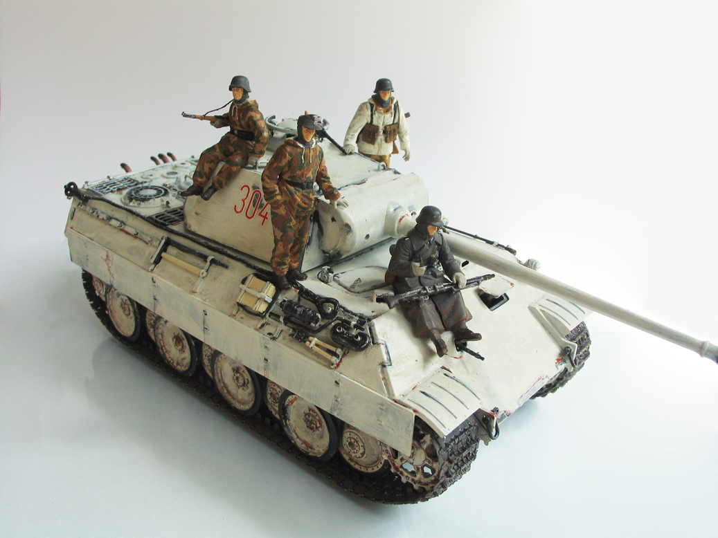 Мда... А какого цвета пантерка под камуфляжем? Судя по всему - красно-серо-чёрная? Крепления заптраков на корме надо было либо закрывать, либо переделывать, смотровые щели остеклить, гусеницы покрасить... В общем, не айс, можно было сделать лучше. Фигурки хороши зато, понравились)