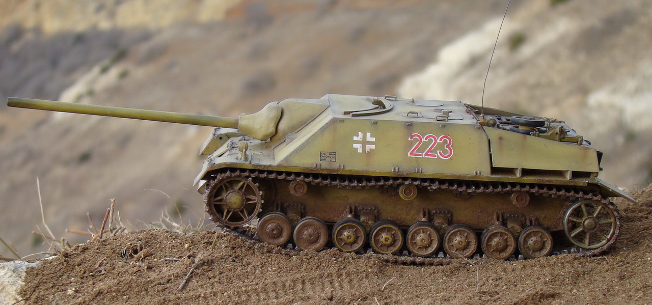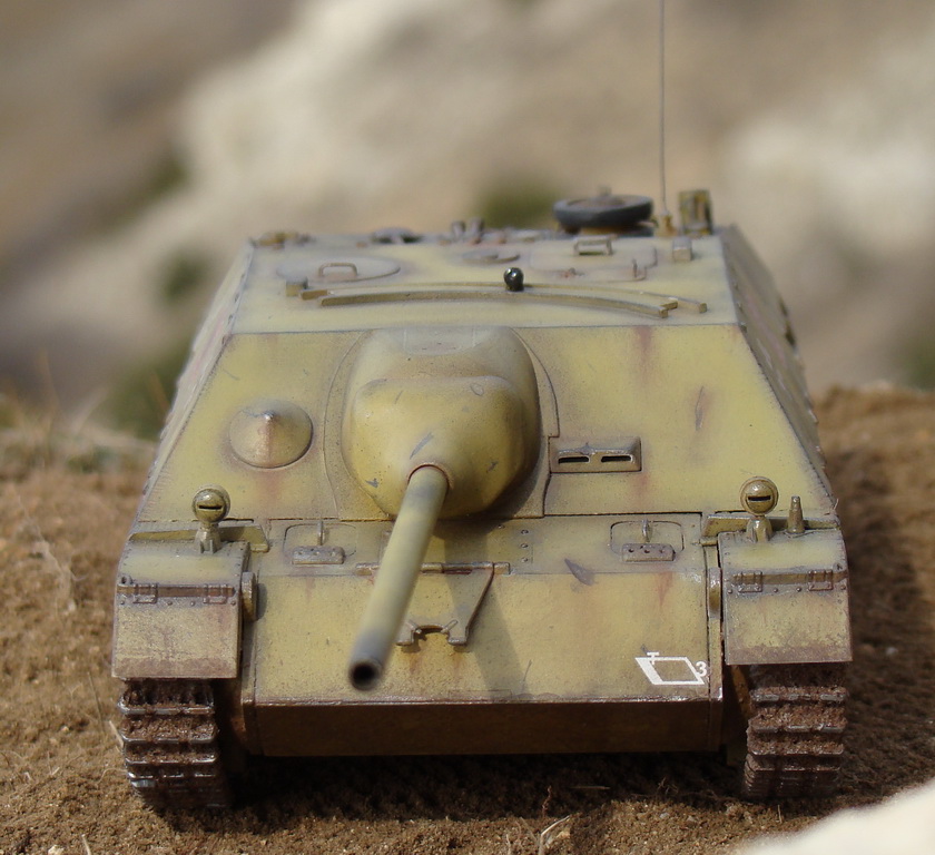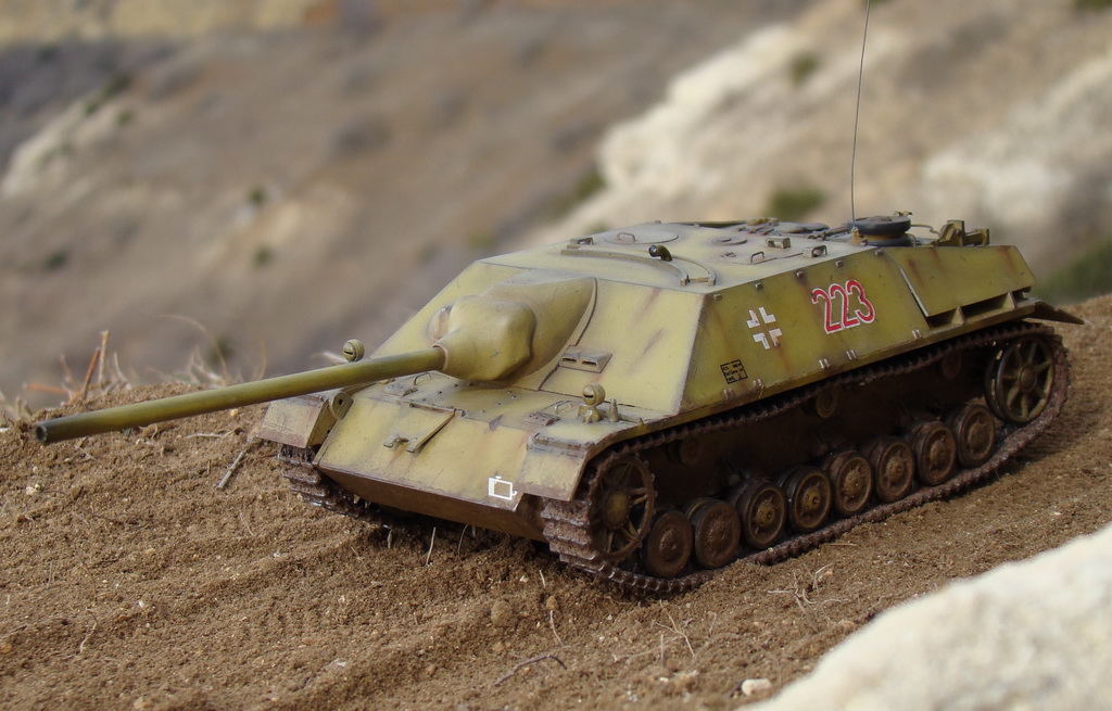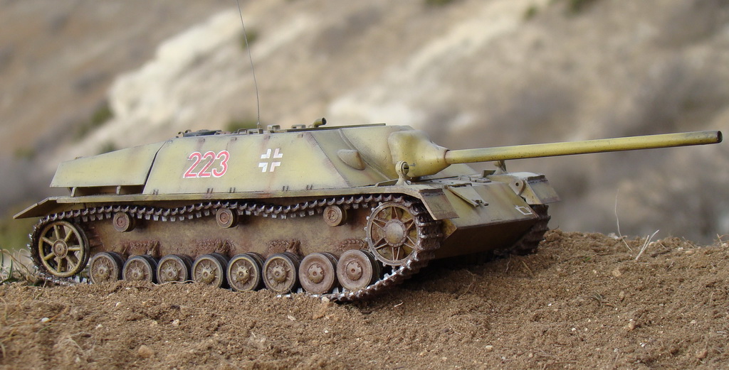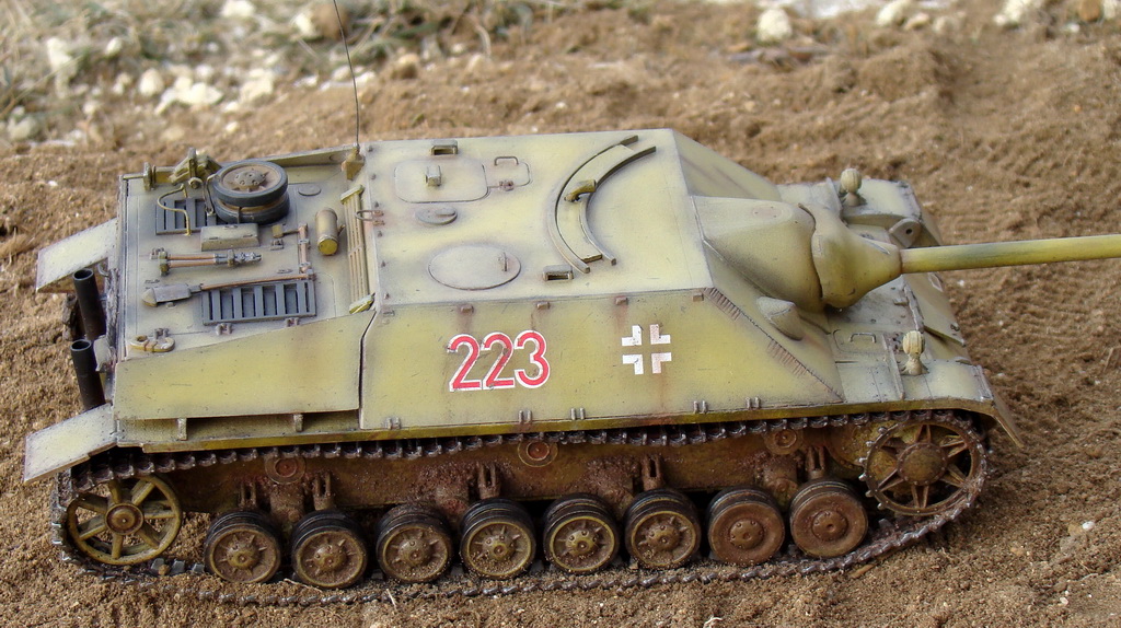 Доброго времени суток коллеги. Выношу на Ваш суд модель немецкой ПТ САУ ягдпанцер IV. Эта модель не моя, но я принимал участие в сборке, и полностью красилмодель со всеми вытекающими. Модель принадлежит другу, как и предыдущий "Фердинанд". Это моя вторая модель БТТ, решил попробовать съэмитировать грязь на траках, местами парочка вмятин. Сама модель полностью из коробки, причем имеются не соответствия по матчасти, хозяин модели не стал уделять этому вопросу ни грамма времени, его интересует просто внешние восприятие, что бы на полочке смотрелось, я перечить не стал.