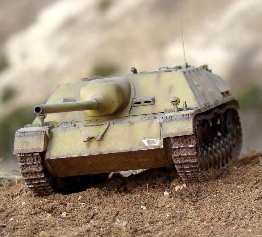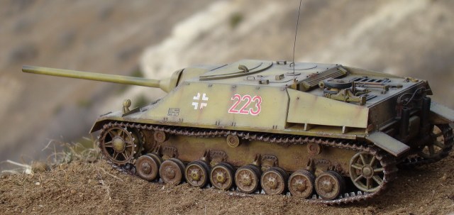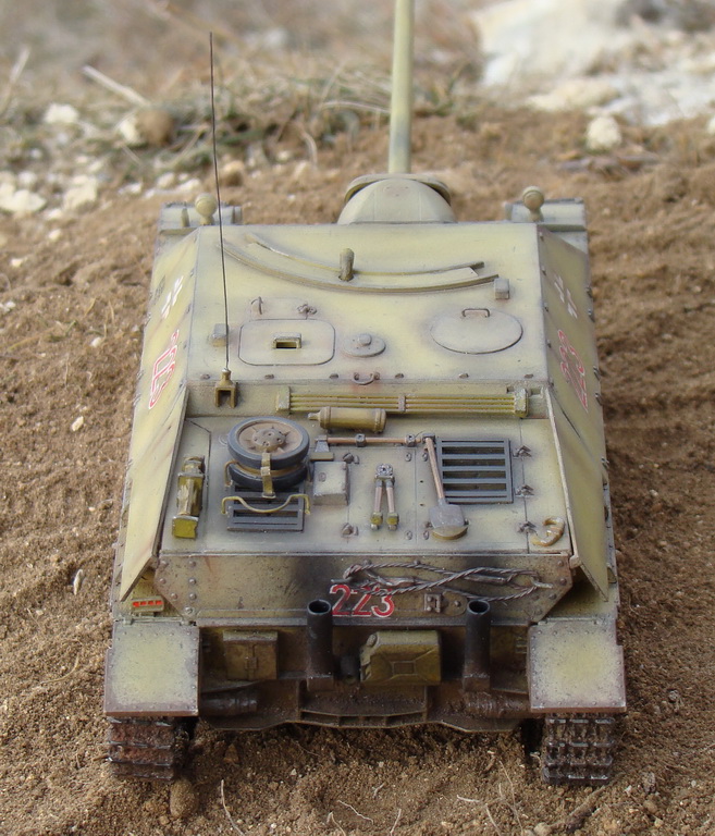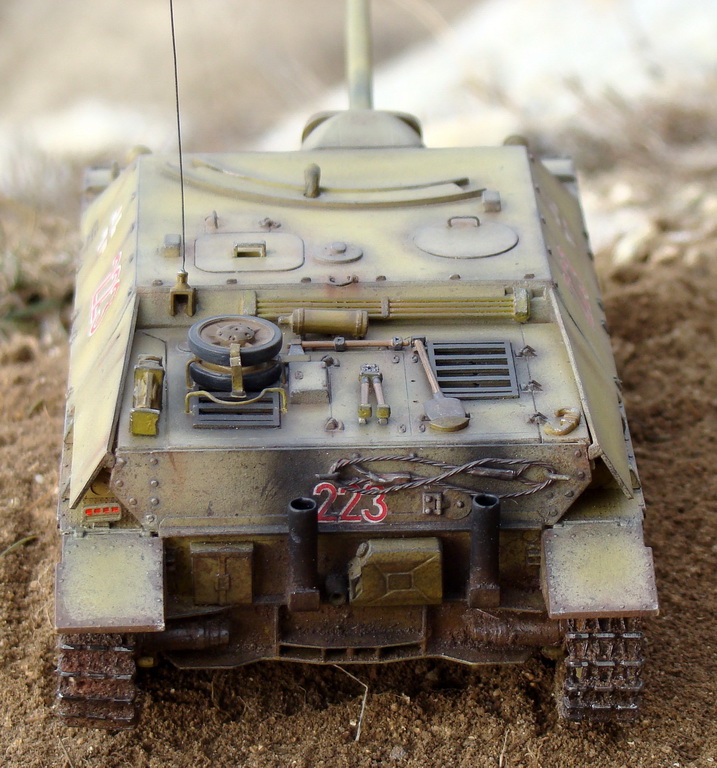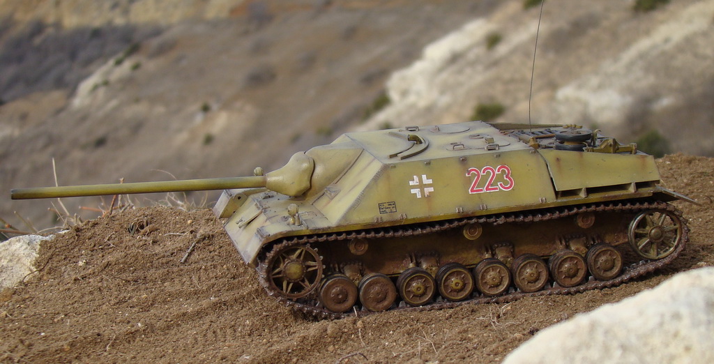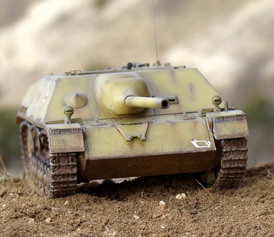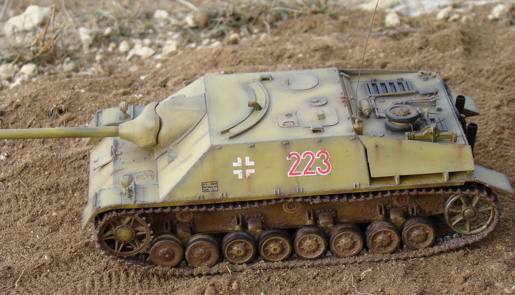 Доброго времени суток коллеги. Выношу на Ваш суд модель немецкой ПТ САУ ягдпанцер IV. Эта модель не моя, но я принимал участие в сборке, и полностью красилмодель со всеми вытекающими. Модель принадлежит другу, как и предыдущий "Фердинанд". Это моя вторая модель БТТ, решил попробовать съэмитировать грязь на траках, местами парочка вмятин. Сама модель полностью из коробки, причем имеются не соответствия по матчасти, хозяин модели не стал уделять этому вопросу ни грамма времени, его интересует просто внешние восприятие, что бы на полочке смотрелось, я перечить не стал.