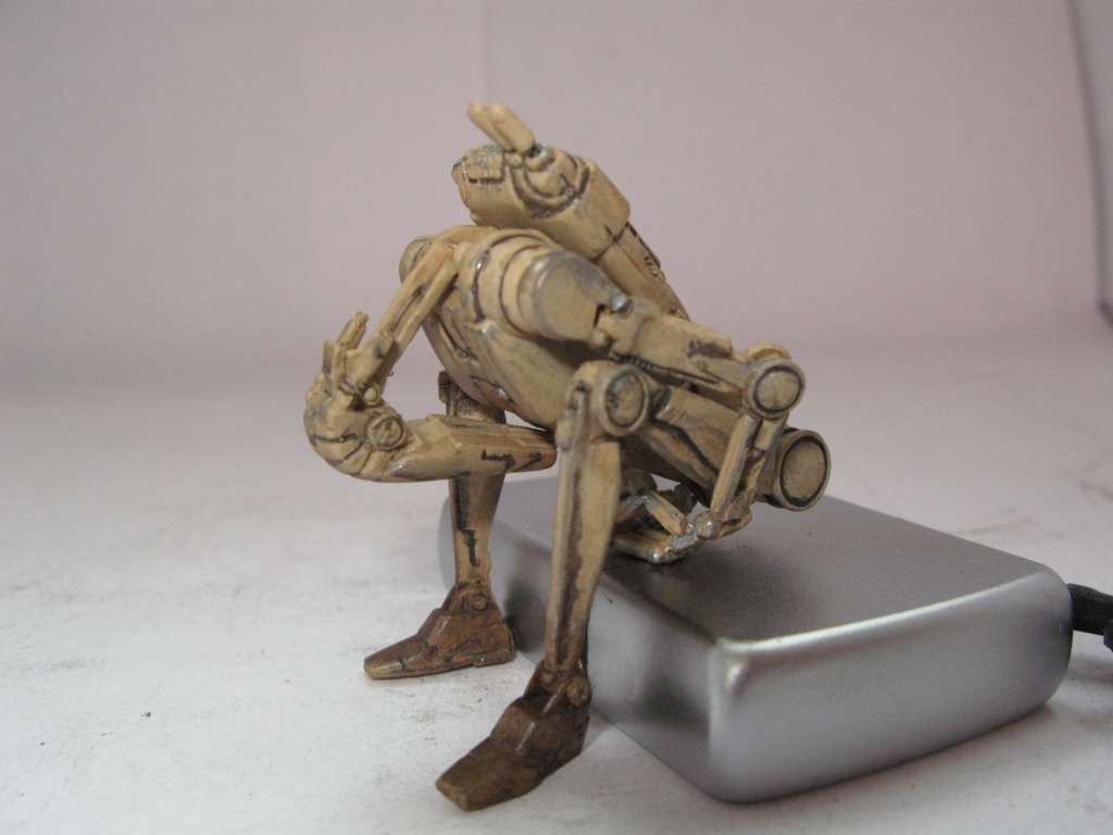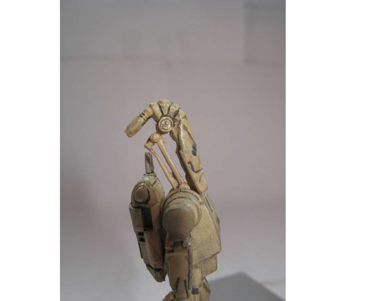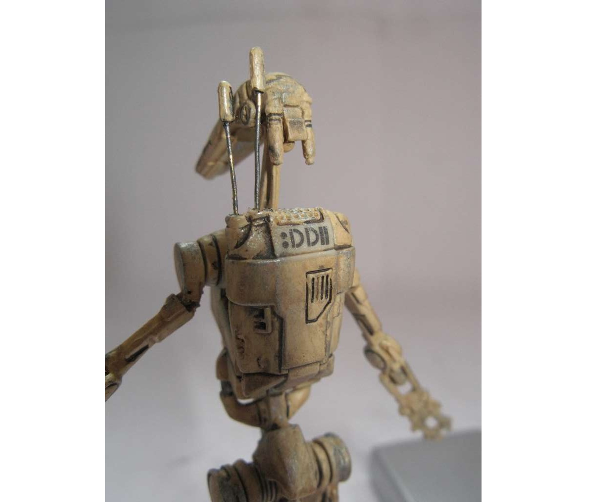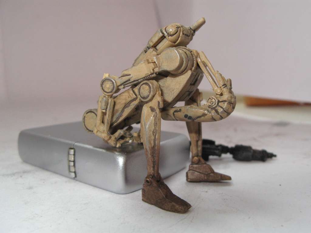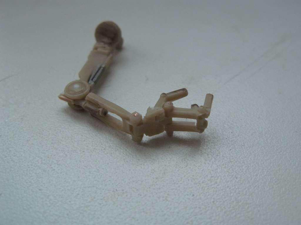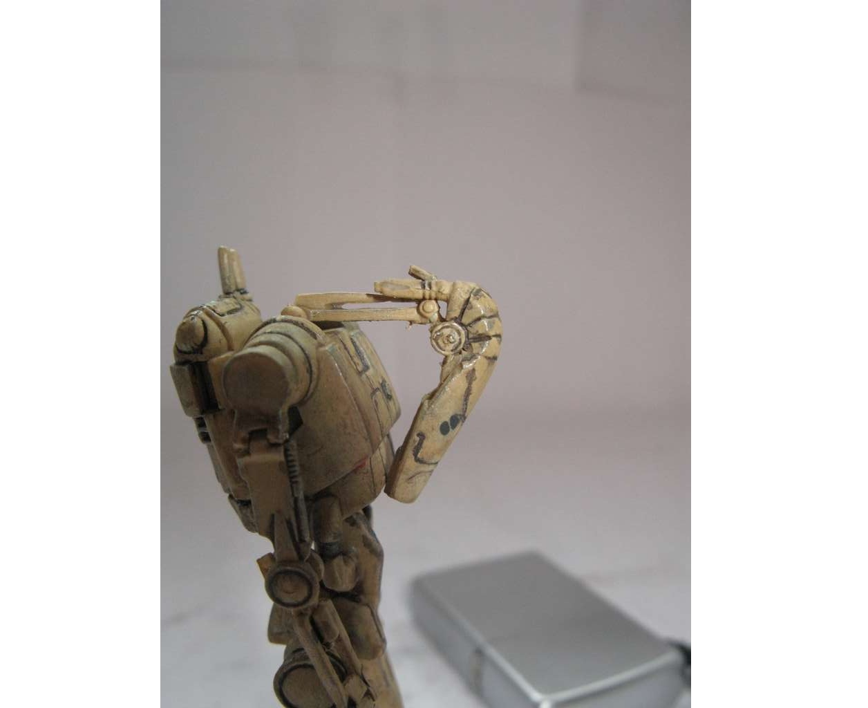 Так как дроид выглядел убого, решил поработать над ним. Решил сделать все подвижным, как должно быть. Но не вышло. Фигурка была сделана из какого-то резино-пластика (может жесткий каучук). Этот материал не поддавался натфилю и шкурке, шпаклевка не ложилась. Можно только резать. Вот и начал резать. Постарался сделать все суставы дроида подвижными. Использовал проволоку разных диаметров. Антенны сделал убирающимися.