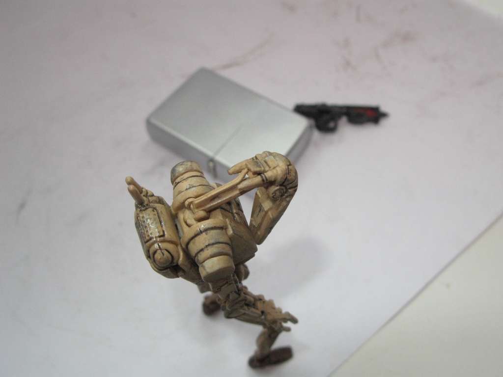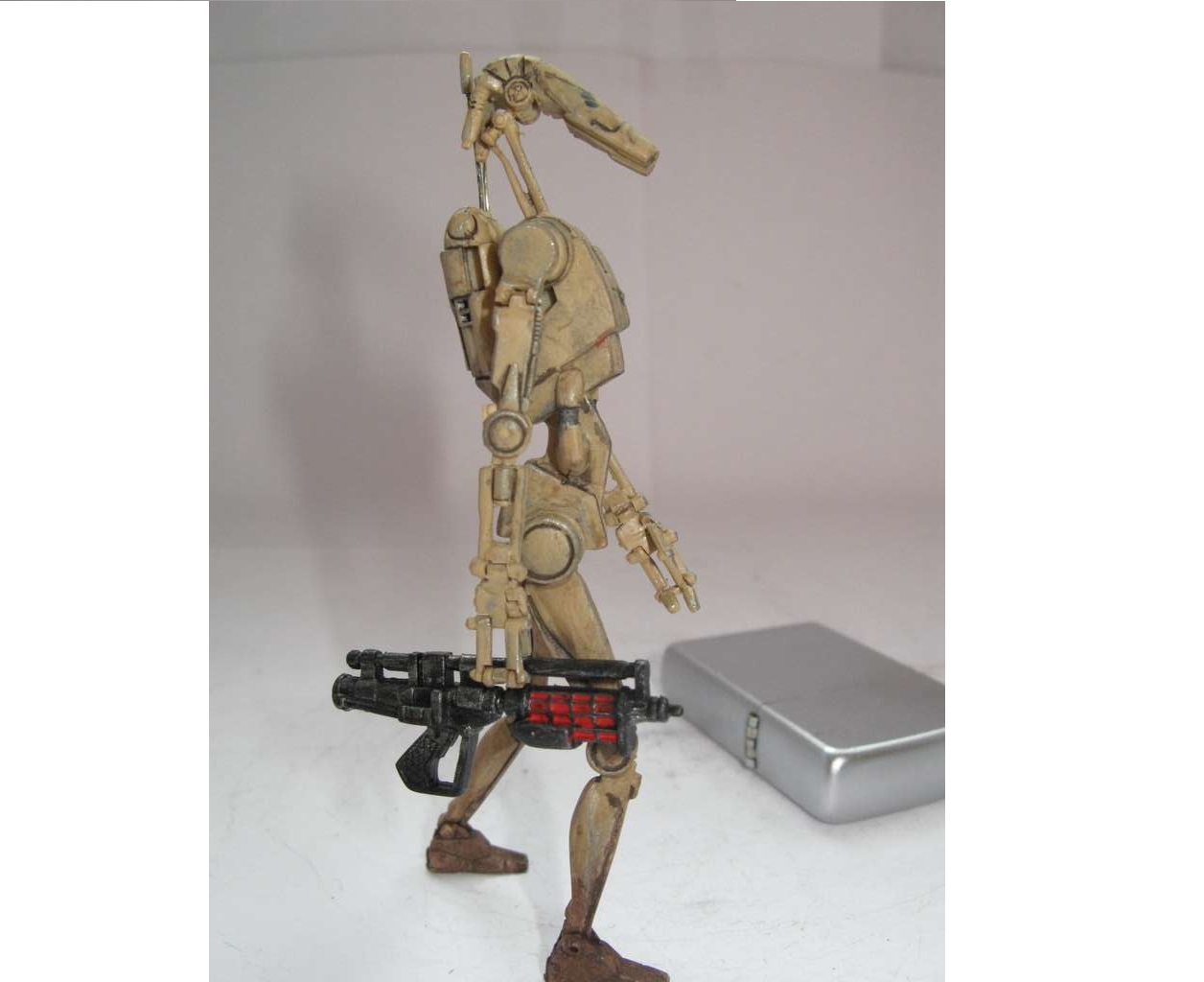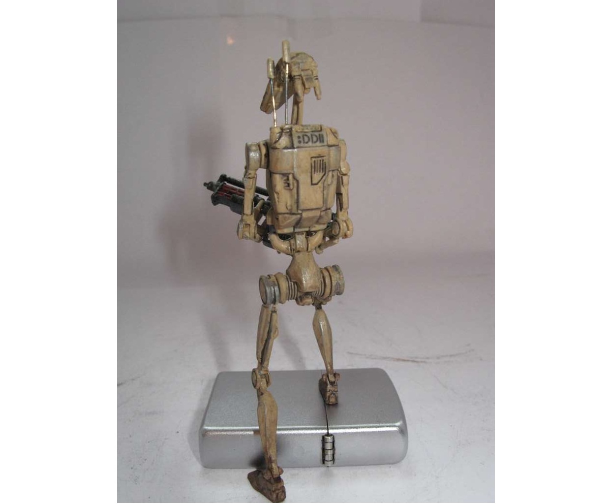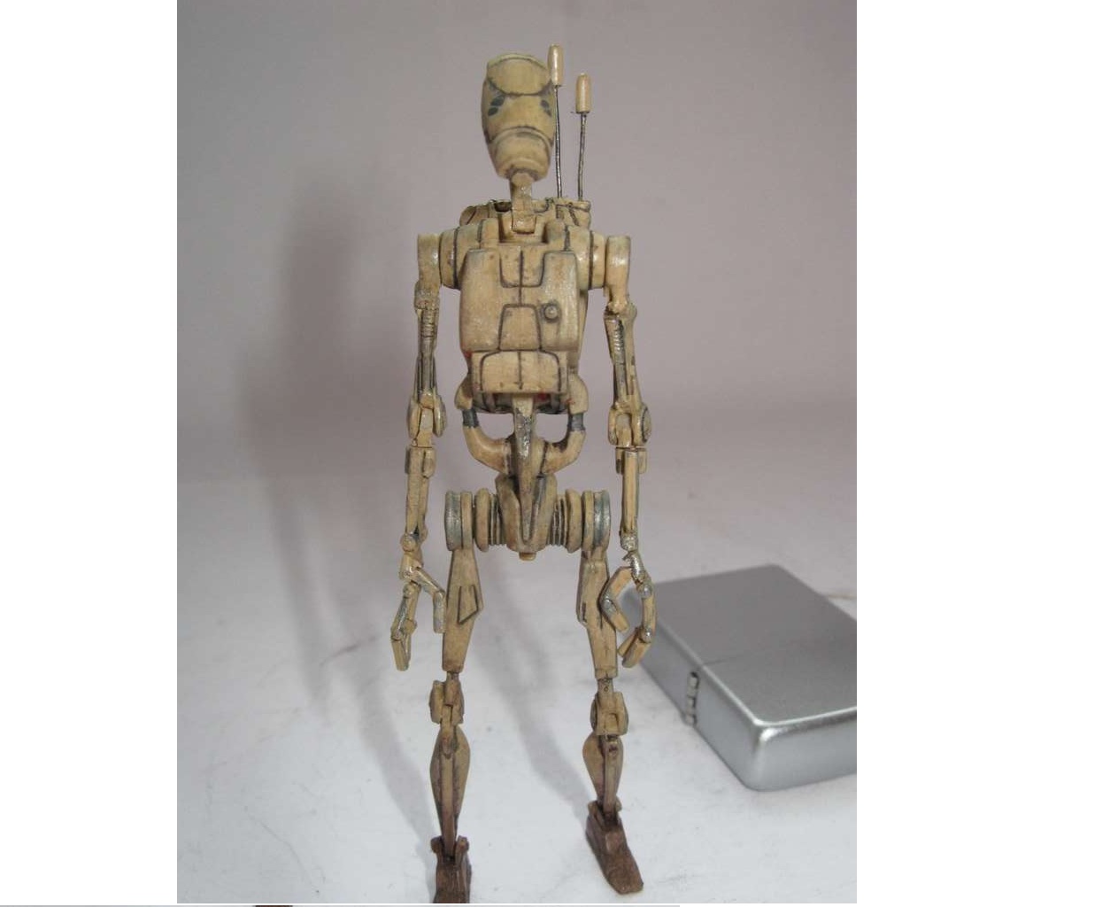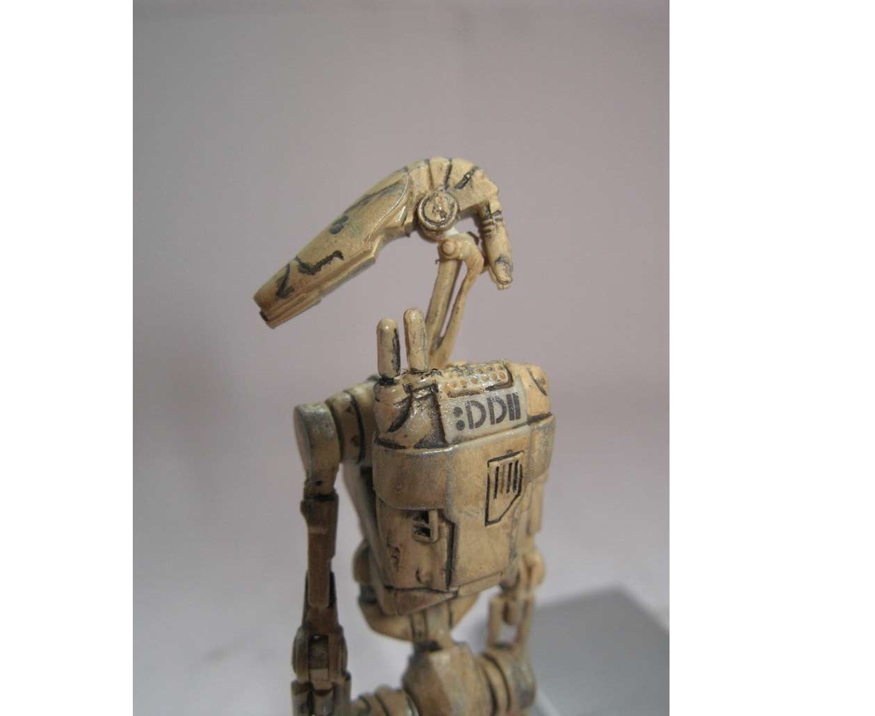 Так как дроид выглядел убого, решил поработать над ним. Решил сделать все подвижным, как должно быть. Но не вышло. Фигурка была сделана из какого-то резино-пластика (может жесткий каучук). Этот материал не поддавался натфилю и шкурке, шпаклевка не ложилась. Можно только резать. Вот и начал резать. Постарался сделать все суставы дроида подвижными. Использовал проволоку разных диаметров. Антенны сделал убирающимися.