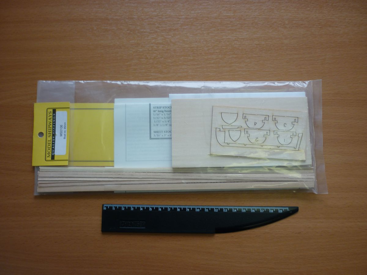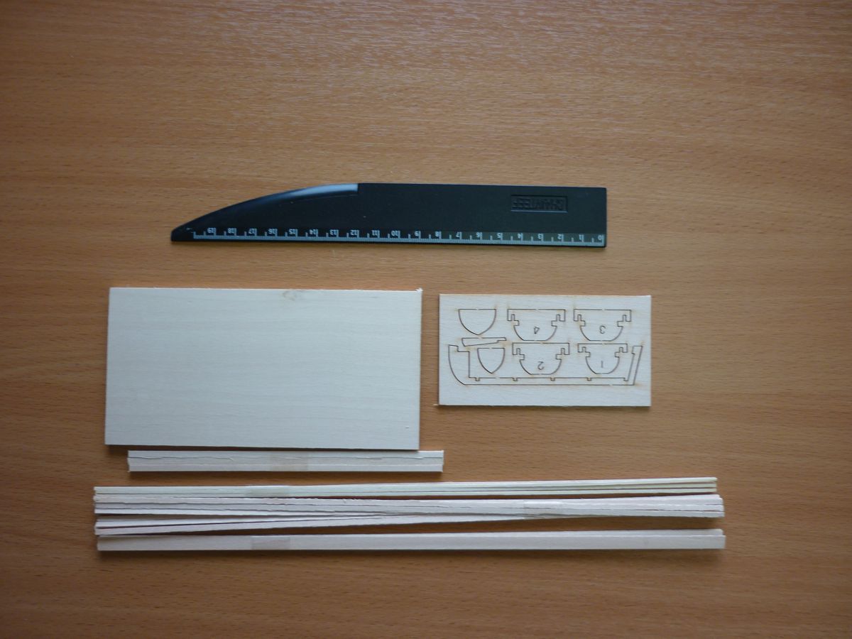 Корпус наборный из шпангоутов и киля, вырезанных лазером. Обшивается рейками. В комплекте инструкция по сборке и стапель