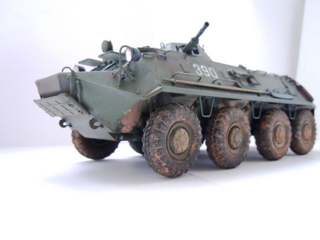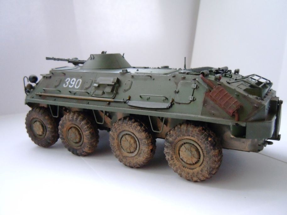 Хорошая работа! БТР выглядит впечатляюще. Но вот с грязью незадача: раз уж она налипла такими толстыми пластами, то должна покрывать весь низ. Впрочем, это еще не поздно исправить, можно просто задуть низ жидкими пигментами.