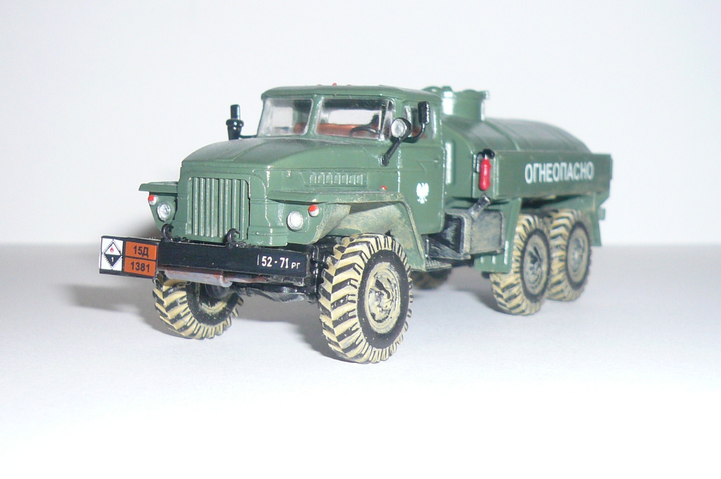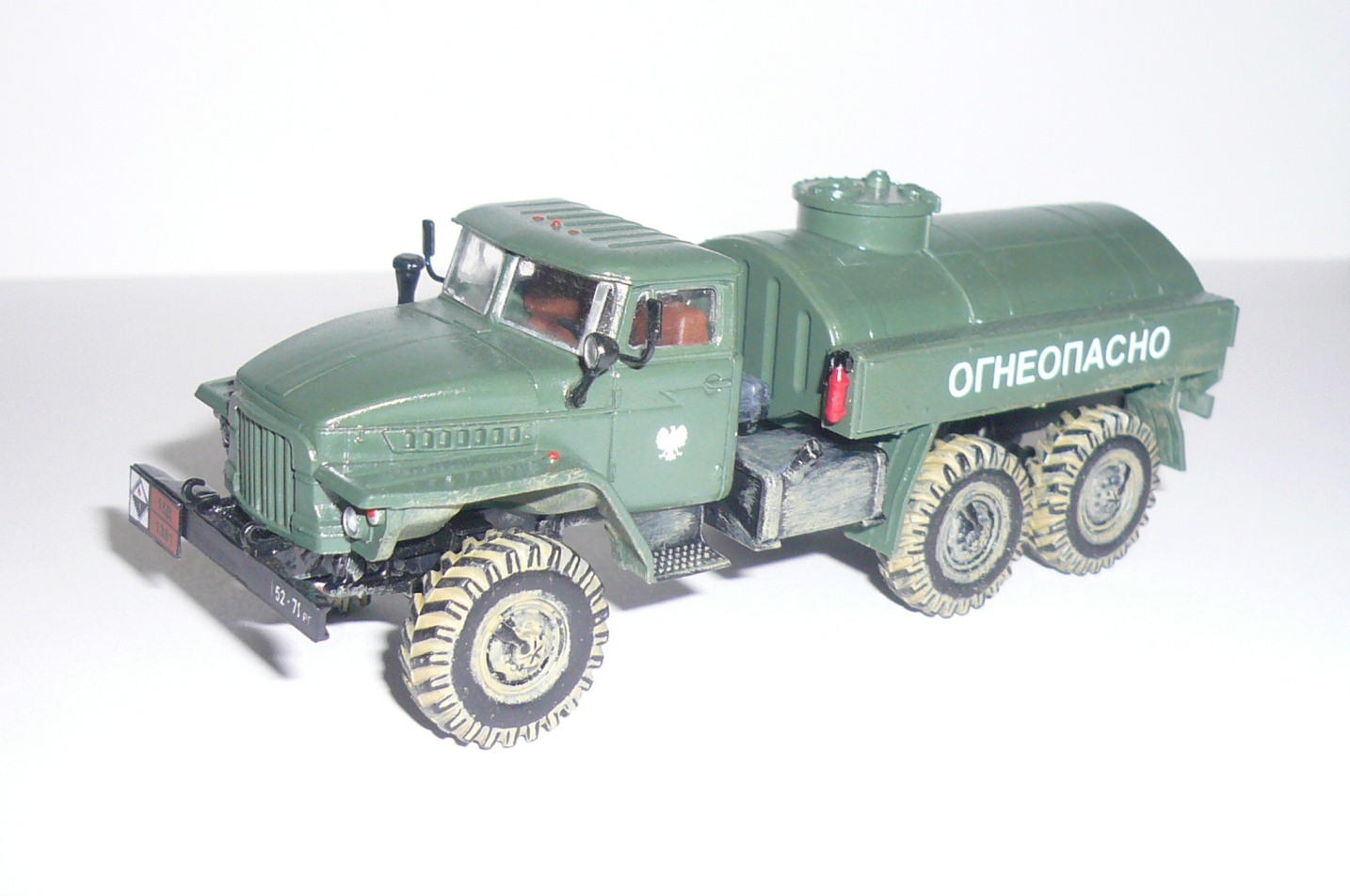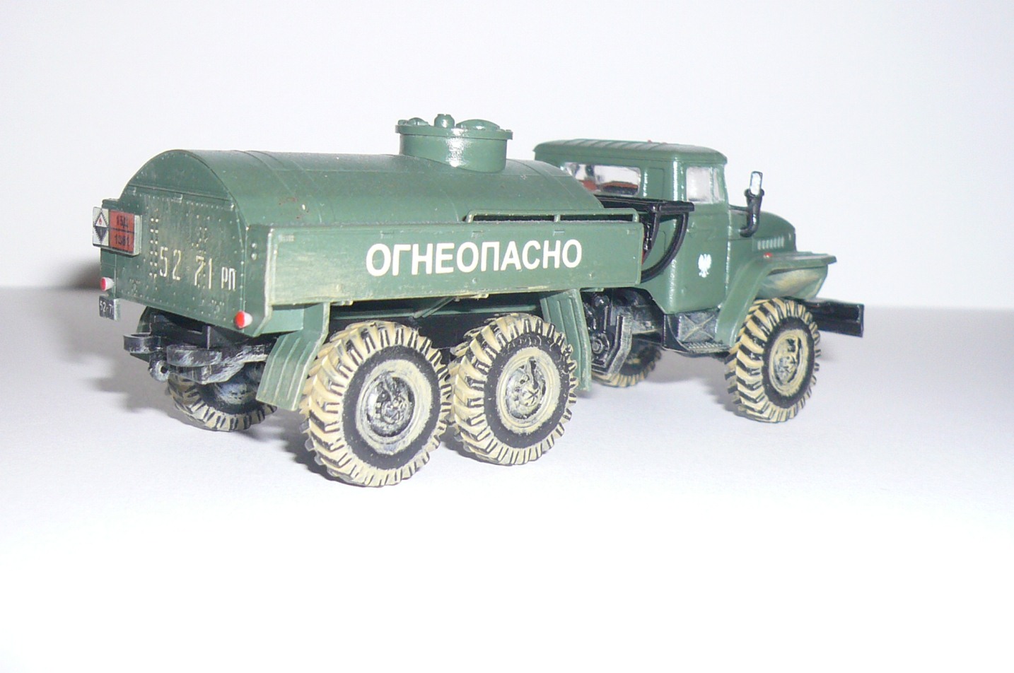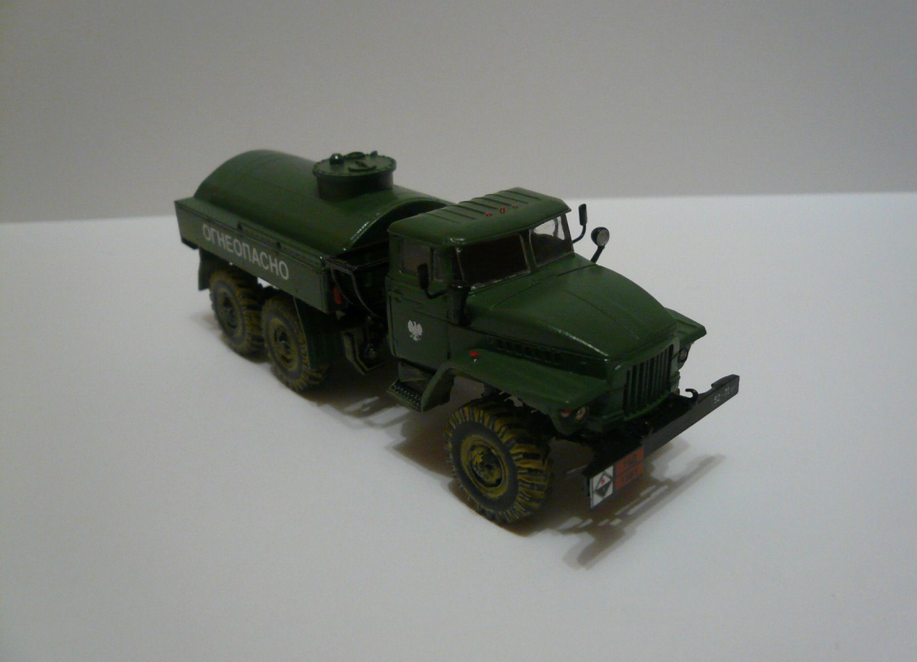 Хорошая такая изкоробка,немножко не вяжется между собой надпись огнеопасно,наши номера и эмблема войска польского.На следующей модели попробовать тонировку,смывку и потом уже пачкать.