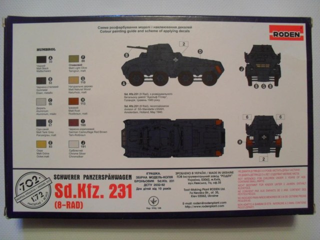 Краткая историческая справка: Schwerer Panzerspähwagen Sd.Kfz.231 8-Rad — германский тяжёлый бронеавтомобиль 1930-х годов. По германской ведомственной системе обозначений военной техники носил индекс Sd.Kfz.231 (8-Rad). Был разработан в 1934—1936 годах для замены не отвечавших новым требованиям неполноприводных трёхосных бронеавтомобилей Sd.Kfz.231 (6-Rad) и стал первым в мире полноприводным четырёхосным бронеавтомобилем. Sd.Kfz.231 являлся одним из наиболее технически совершенных бронеавтомобилей своего времени и был способен действовать на пересечённой местности, обладая сравнимой с танками проходимостью. Серийное производство Sd.Kfz.231 осуществлялось в 1936—1943 годах, всего было выпущено 607 бронеавтомобилей этого типа в линейном и ради́йном, под обозначением Sd.Kfz.232, вариантах. Sd.Kfz.231 поступали на вооружение разведывательных подразделений вермахта и активно использовались им в ходе Второй мировой войны на всех театрах военных действий