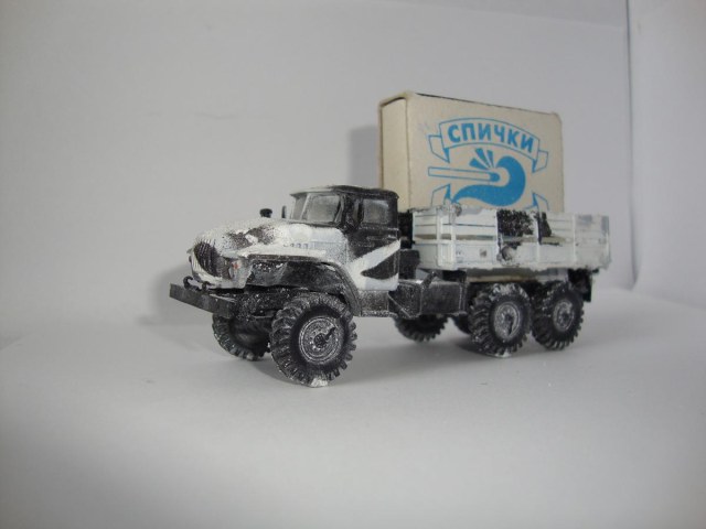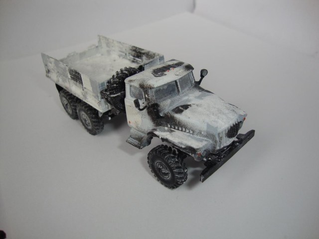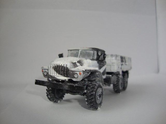 Доделал Урал. Сделал зимний камо баллончиками, он мне не понравился-решил заснежить. Модель не нравится самому-потом сделаю новый Урал, но лучше.