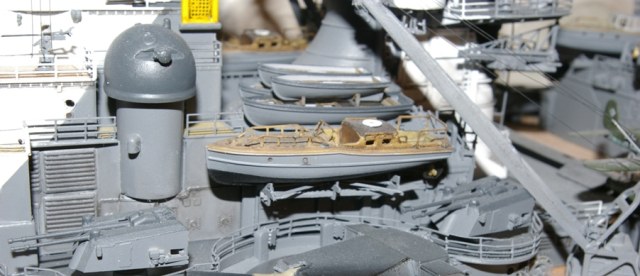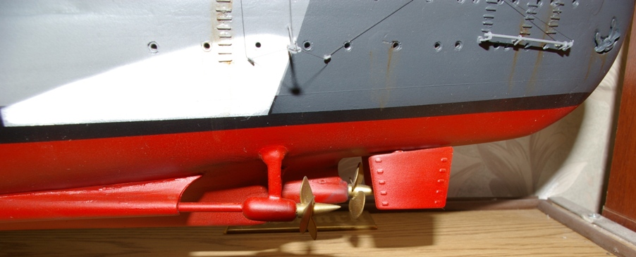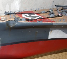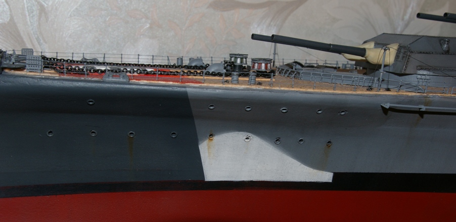 "Придиризм" №1. Нелогично распределённые подтёки ржавчины довольно сильно портят общее отличное впечатление. Или уж тогда его вообще - "старить" весь, включая надстройки, якорные полуклюзы (с обдиром краски от якорных цепей) и пр....., или пусть бы он был - как новенький. Лично мне по душе был бы второй вариант.
