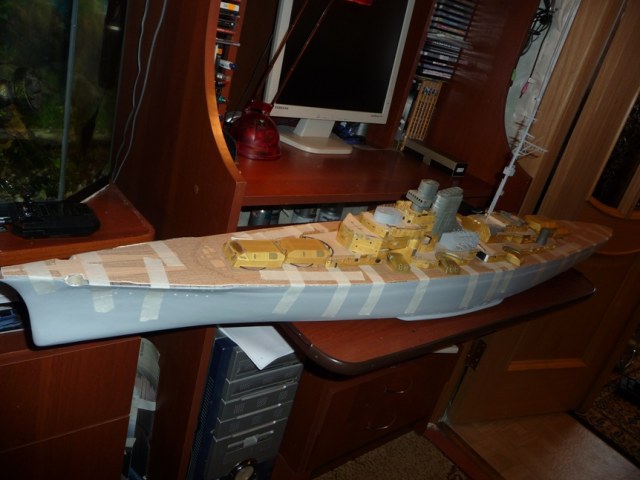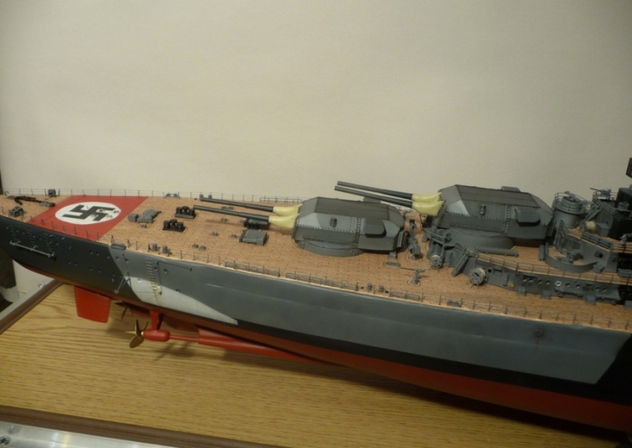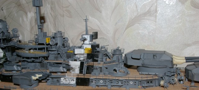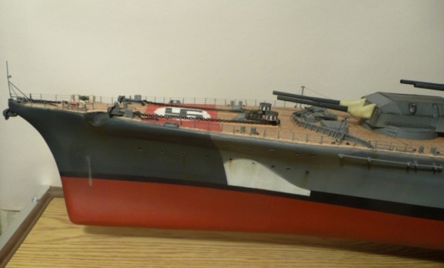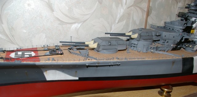 )))Детали некоторые потерял,как же без этого.Штук 7-8 пришлось изготавливать из остатков старых моделей,а буквально 22 февраля обнаружил,что носовой якорь пропал куда-то.Спасло то,что в магазине для судомоделистов продается похожий якорь,из металла.Надфиль ,10 мин работы-и всё.Еще раз за такой проект если и возьмусь,то не скоро.Тяжеловато,всё-таки.Корабль здоровый,места в квартире не хватает.Вот сейчас появился похожий проект-"Цесаревич".Его бы я собрал с бОльшим удовольствием,чем фашиста.Но "Бисмарк" опередил...