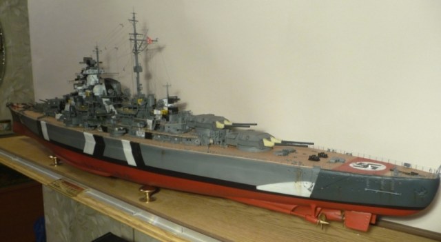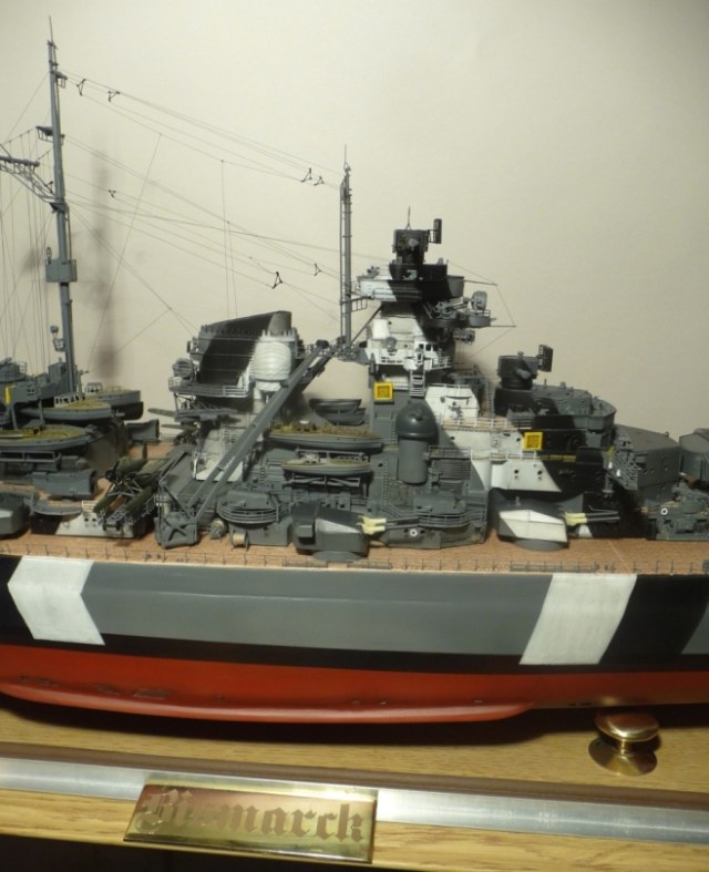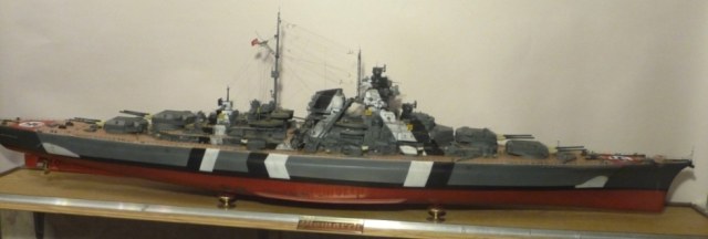 Это было небольшое отступление от темы,теперь про саму модель. Собирался корабль долго,иногда хотелось забросить это дело.В первой половине номеров задач на неделю было немного ,с последующими всё больше и больше.Например,если с 1 по 130 номер у меня уходила 1 неделя на каждый номер,то с 134 по 140(финальный) ушло 4 месяца.Модель состоит из фанеры и шпона (корпус) ,огромного количества травла ,немного пластика и смоляных деталей.Наибольшую сложность представляли для меня шлифовка корпуса,такелаж и особенно леера-это 304 столбика,под каждый нужно сделать отверстие ,через каждый столбик проходит 3 ряда лески.Также оказалось непросто покрасить надпалубные надстройки.Выбранный мной "балтийский камуфляж" ,который "Бисмарк" носил на испытаниях на Балтике и на момент выхода в свой первый и последний поход ,оказался сложнее,чем мне казалось,не буду расписывать,почему.В общем,работа подошла к концу,и устал я от "фашистского утопленника" ,и одновременно испытываю чувство огромного удовлетворения.Вот что плохо-на фотках все равно не видно многих мелких деталей.Реальный масштаб 1:200 ,в описании указан 1:350 ,потому что в предлагаемых вариантах это ближайший.