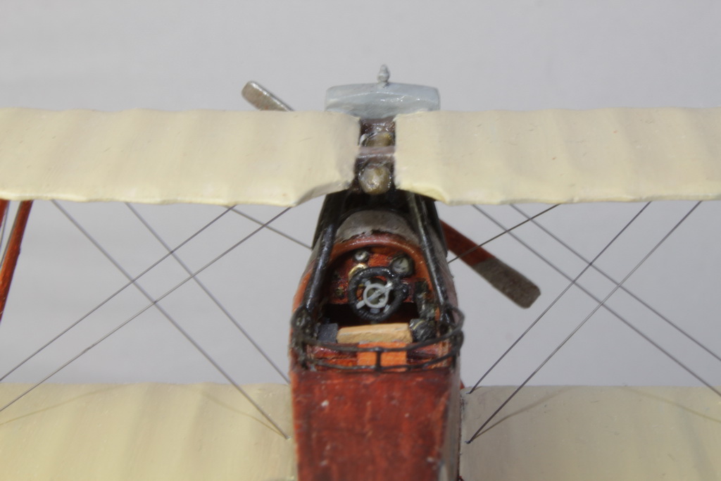 Список переделок таков: перепилен корпус из 27-й серии в 65-ю; нарощена высота фюзеляжа в хвостовой части; движок изготовлен с нуля; весь интерьер тоже изготовлен с нуля - пол наборный деревянный, топливные баки, приборы, сиденья, радио и т.п.; на крыльях и оперении сделан провис нервюр; стойки и пропеллер вырезаны из дерева; радиатор и рама шасси - самодел, колеса от родена из закромов, ограждение - гнутый корабельный леер, ОЗ и эмблемы накрашивал вручную. Короче, в готовой модели не осталось ни одной детали из набора, не переделанной либо не замененной ))