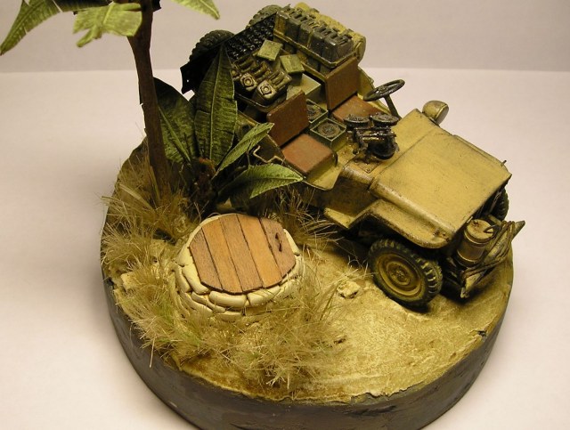 Первоначально была идея "Бойцы SAS остановились у колодца в оазисе и набирают воду в канистры", но потом понял, что не смогу нормально показать глубину колодца, пришлось закрыть его крышкой
