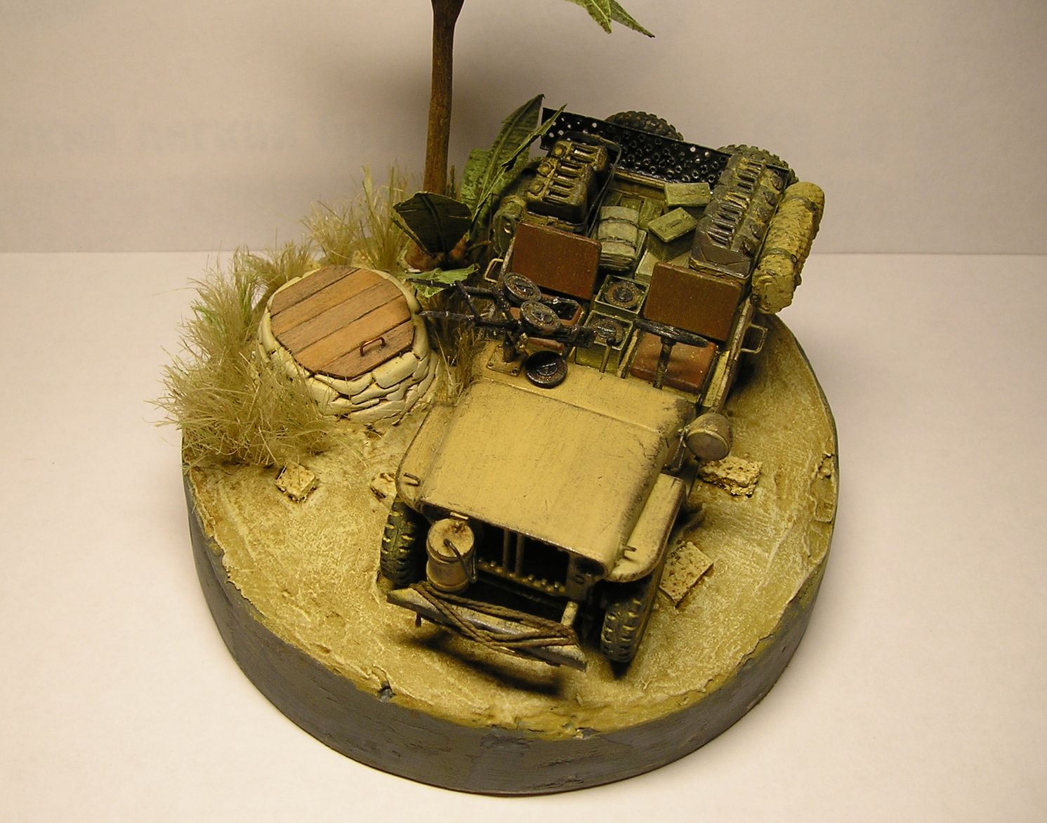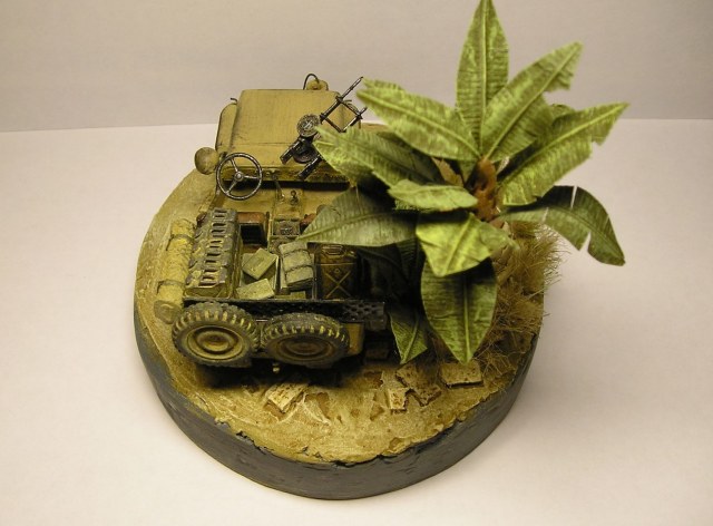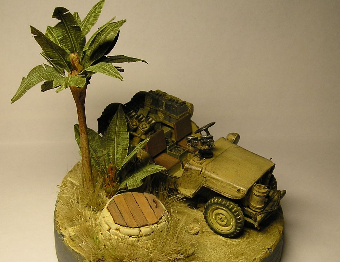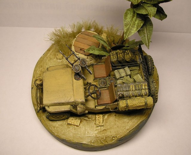 Не так давно увидел на этом сайте виньетку в 1:72 в пальмой - захотелось сделать такую же. В качестве модели был выбран Tamiya SAS Jeep. Канистры отправились в помойку сразу, вслед за ними полетел водитель. Зато очень хорошо сделаны Виккерсы (так понравились, что решил оставить один про запас). Эльфовская фара оставалась всего одна, зато большая - сделал из нее прожектор.