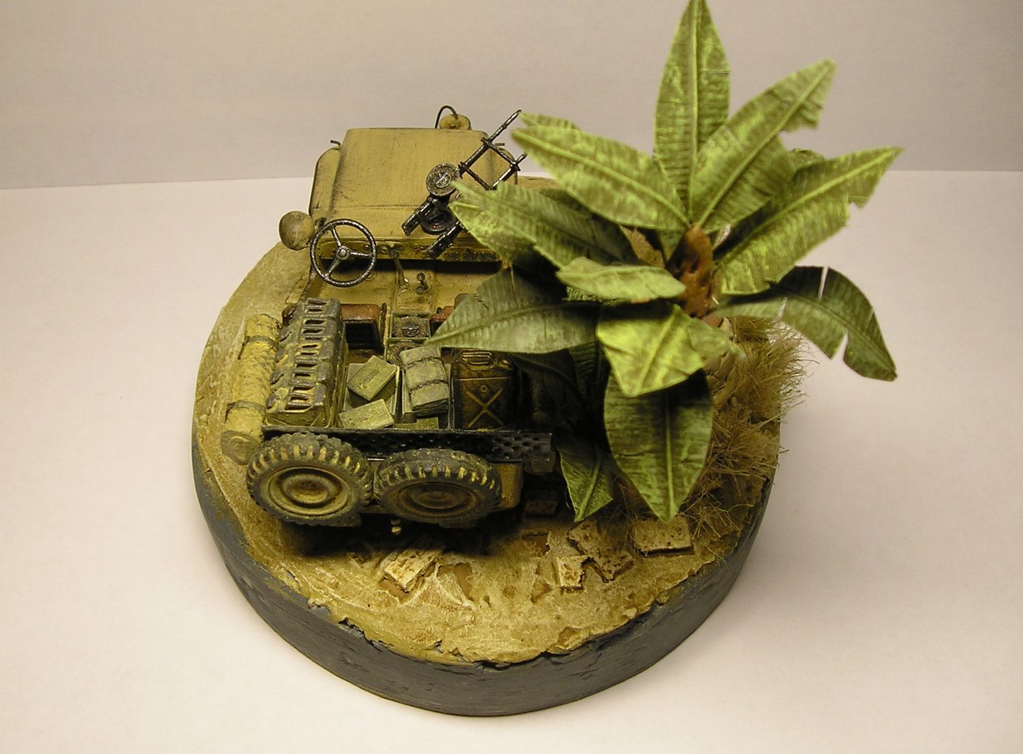 Пальмы делал по рецепту из стендмастера: на заготовку из фольги приклеивал кусок проволоки, прокатывал ребристым колпачком и делал пару надрезов. Затем грунтовал и красил.