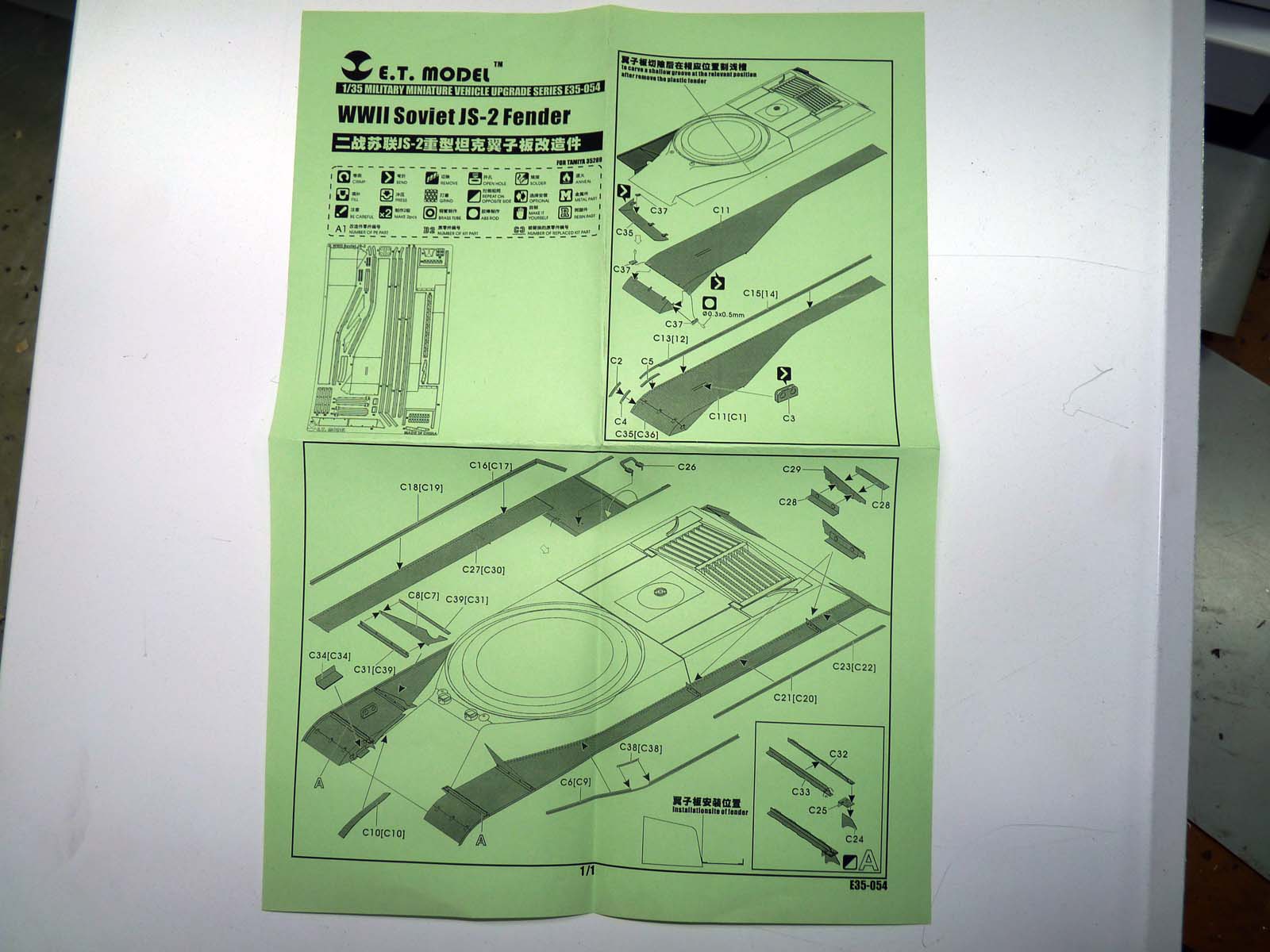 Представляю на ваше обозрение набор травления от E.T. model для ИС-2 надгусеничные полки (fenders). В упаковке находится одна большая плата травления и инструкция на одной стороне листа формата А-4.