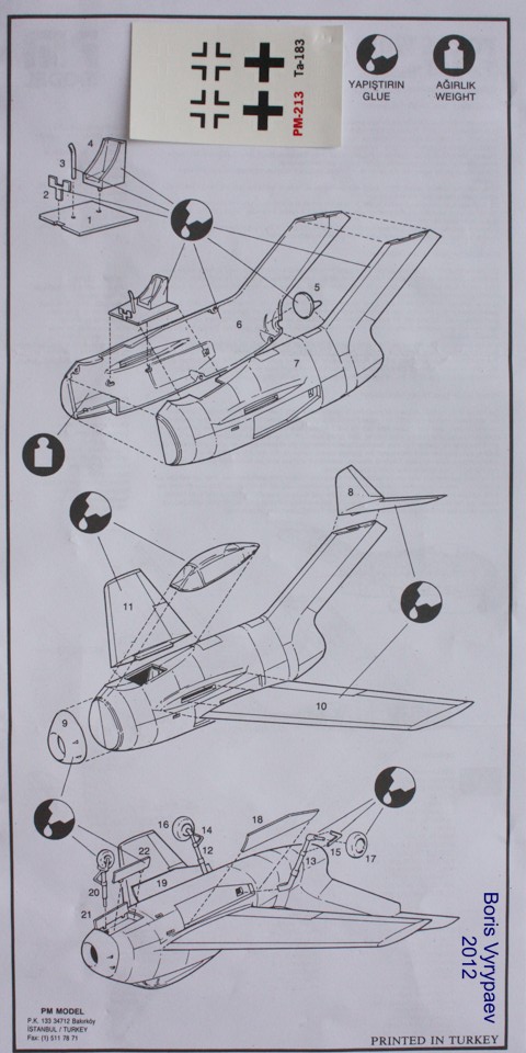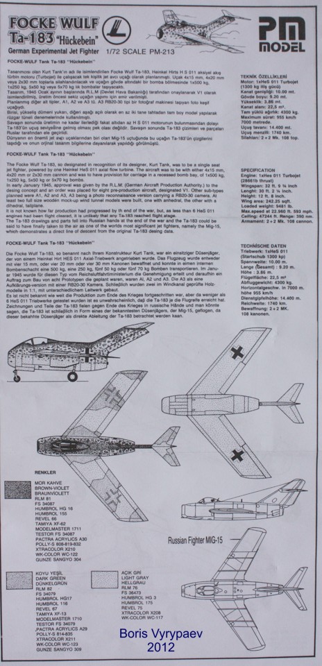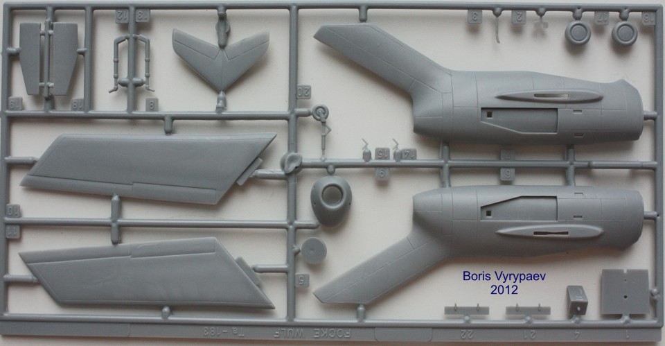 Представляет собой убогую заготовку. Тем не менее, из неё можно сделать. прекрасную модель. Для этого однозначно надо преработать ниши шасси, кабину, тракт двигателя. Шасси сделать заново, естественно ("Экипаж" на эту модель колёса делает). Ну и подвесить ракеты Х-4.